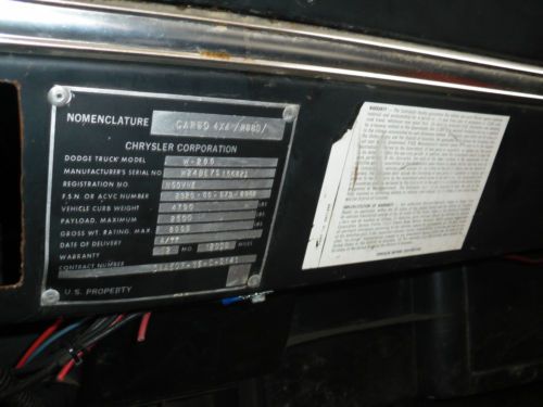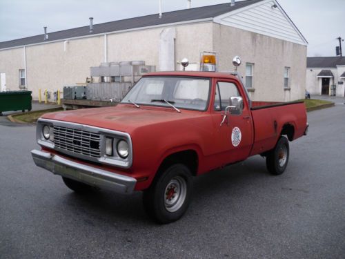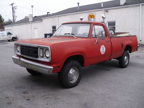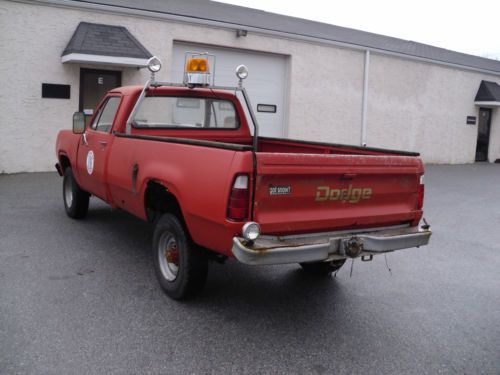 1977 Dodge Power Wagon W200, 50,800 original miles. This is a retired military then township/fire truck. Listing a project truck due to rocker/floor rust mainly but the truck starts right up, runs/idles great and goes into all its gears. The brakes work, no leaks, gauges all seem to work, the speedo needle has broken most of the way off. The tires are like new (9.50 x16.5), the seat is in amazing condition and the beacon like does function. 318 V8 ENGINE 727 AUTO TRANS N/P 203 TRANSFER CASE DANA 44 FRONT DANA 60 REAR The pictures should do most of the talking, the last one is how the truck sits. (the center of the grill is just black paint that can easily be removed and the center dog dish caps were added from a later model 250). Any interested buyers should flatbed or trailer this vehicle home. |