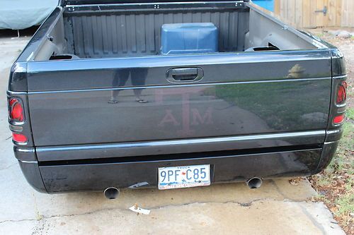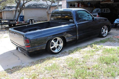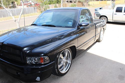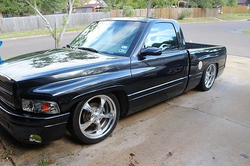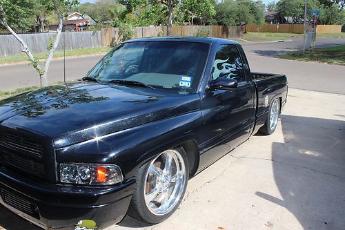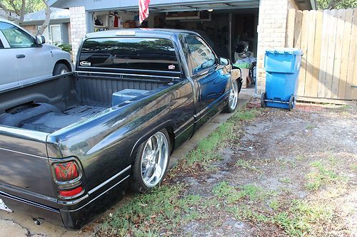 Up for auction is my 1996 dodge ram on keyless adjustable 4 corner airride. Truck was c notched and has link suspension. The bed was cut out and remetaled in for the c notch however the top of the wheel tubs were cut out for clearance. The pumps and tank are mounted below the bed and the truck has 2 brand new optima batteries in the bed. The paint is called black diamond ice pearl and looks as a diamond should sparkle in the sunlight, however the pictures do it no justice. Paint is not perfect, it has a big chip in the front bumper as the pictures show, and a few small scratches that will probably buff. It has billet specialties 20" wheels with 3 fairly good tires and 1 worn tire. The interior is immaculate with the exception of one crack in the dash, and a crack around the drivers side door speaker where it was molded into the panel. It has a nice stereo with rockford three way door speakers, an punch 1600 amp, and kicker 10" subs. Truck has around 141000 miles. Engine runs awesome does not smoke a lick and starts right up. Transmission shifts firm and crisp, and truck is very strong for a 5.2. Has dual exhaust out the back with gibson headers. The truck also has the Texas A&M logo painted into the tailgate, very nicely done. Truck has aftermarket mirrors front bumper and billet grille. The truck sits right and rides very smooth when set at the proper height. Truck also has a small oil leak I believe it is a valvecover gasket, however I have not looked into it due to My recent handicap. The truck is gorgeous to look at despite the very few flaws, and will be sold for a fraction of what it cost to build. The truck is being sold because I recently had a motorcycle accident and am no longer able to drive a motor vehicle.