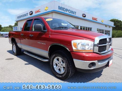 Thanks for Shopping at Midpoint Chevrolet check out this nice 2006 Dodge Ram 1500 SLT. This vehicle is equipped with many options. Power Door Locks. Power Windows. Check out the Wheels on this one.....Alloys always improve the look of your ride! Stay cool on those long summer road trips. Just switch the A/C on and escape the heat! With Tilt Steering you can adjust the Wheel to a position you like! Help maintain your speed with Cruise Control....Making life on a trip a lot easier! Safety First....Airbags save lives and this one has a Drivers Airbag. This vehicle has nice looking Cloth Interior. Tired of listening to the Radio?? This vehicle also includes a CD player to play your own music. Dont worry about jacking up your truck bed hauling stuff for your friends, this Truck has a bed liner already installed! Running Boards make getting in and out of this Vehicle easier. Anti-Lock Brakes are a must have on vehicles that are safe..This on has ABS! Ready Set TOW!! This vehicle has a towing hitch installed and is ready to go!! Be Ready for Winter or Slippery conditions..Four Wheel Drive gets you where you want to go. Talk to one of our professional sales representatives today to get more information on this one! Call Sales Team at 888-348-7942 now! Find your next used vehicle at Midpoint Chevrolet Buick GMC. In addition to providing vehicle makes like Pontiac, Cadillac, Dodge, Ford, Honda, Toyota, Hyundai, and Subaru, we supply customers with a committed sales staff with over 22 years of service, a full service GM Certified service department, & much more. Vehicle prices do not include taxes, DMV fees, or $399 dealer processing fee.