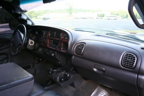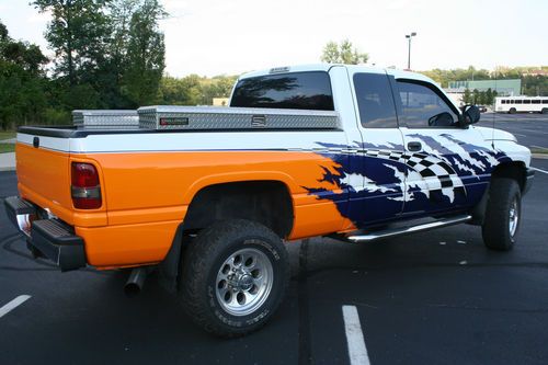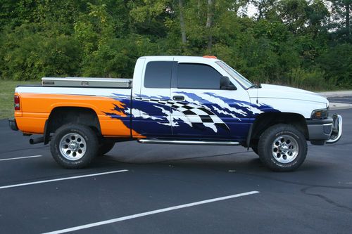 1999 DODGE RAM QUAD CAB 4X4 SHORT BED. THE PAINT AND BODY ARE THE BEST YOU WILL FIND AT ANY PRICE. THE GRAPHICS ARE PAINTED ON AND THEN CLEAR COATED OVER. MANY HOURS WENT IN TO WET SANDING AND BUFFING. THERE IS ZERO RUST ON THE TRUCK. THESE TRUCKS ARE KNOWN FOR THE BOTTOM OF THE DOORS RUSTING,THERE IS NONE. THERE IS NOT EVEN A SCRATCH ON THE TRUCK. ALL THE CHROME IS EXCELLENT. THE INT OF THE TRUCK IS LEATHER AND IS STILL IN GREAT SHAPE. I GETS THUMBS UP ALL THE TIME WHILE DRIVING IT. THE WHEELS ARE ION ALLOYS. EVERY THING WORKS AS IT SHOULD. MILES ARE GOOD, AND IT RUNS SUPER STRONG. ITS A NON 53 BLOCK. IT HAS 150HP INJECTORS. RAPTOR FUEL PUMP, EDGE HTC PROGRAMER,4" EXHAUST. THE TRANS WAS DONE (4900.00 I HAVE THE RECEPIT). A LITTLE HISTORY ON THE TRUCK,I BROUGHT IT BACK FROM ST LOUIS. IT WAS OWNED BY THE OWNER OF A BODY SHOP APPARENTLY AT ONE TIME THE BED WAS DAMAGED (REASON FOR THE PRIOR SALVAGE TITLE) THE INSURANCE COMPANY ISSUED A LARGE CHECK SO HE SUNK IT ALL BACK IN THE TRUCK. ITS VERY FAST ,STONE COLD RELIABLE, AND LOOKS SPECTACULAR...