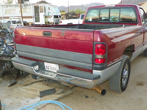 P L E A S E R E A D C O M P L E T E D E S C R I P T I O N B F O R E B I D D I N G ! ! ! 94 DODGE RAM TURBO DIESEL, SINGLE CAB , 2 DR , LONG BOX , BALL HITCH AVAILABILITY IN BED , TIE DOWNS IN BED AND ON OUTER TOP RAILES , BED LINER , RECIEVER HITCH WITH ELECTRIC HOOK UP BELOW REAR BUMPER,CHROME WHEELS ( F A C T O R Y ) POWER WINDOWS, DOOR LOCKS , BUCKET SEATS ,FOLD DOWN CENTER ARM REST/COMPARTMENT , VERY NICE INTERIOR, NO TARES , NO WARE SPOTS , NICE CARBET WITH REMOVEABLE FLOOR INSERTS .NEW HEAD LIGHT SWITCH JUST INSTALLED , A/C JUST GONE OVER - BLOWS VERY COLD - NEW WINDSHIELD JUST INSTALLED , AUTO TRANS JUST SERVICED LAST 800 MILES . NEW BRAKES ON ALL 4 WHEELS , FRESH OIL CHANGE / LUBE , TIRES ARE 50 %, 245 X 75 X 16 LOAD RANGE " E " . $500.00 NON REFUNDABLE DEPOST VIA PAY PAL 24 HRS AFTER SALE ENDS OR SALE IS CANCELLED , BALANCE CASH DUE ON PICK UP OR . MUST BE PAID IN FULL 4 DAYS AFTER SALE ENDS ," IF FINAL PAYMENT IS WITH PAY PAL , IT MUST BE ARRANGED WITH SELLER PRIOR TO BIDDING , BY PHONE - 760-254-3361 OR SALE IS NULL AND VOID " . CLEAR / CLEAN TITLE , NO SALVAGE . THIS TRUCK WAS A 1 OWNER .