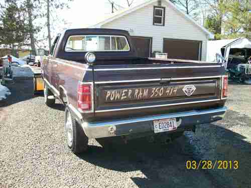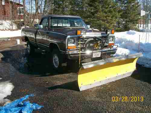 Here for your bids is a nice 1982 1 ton w350 4x4 with lock out hubs, 360 engine, automatic transmission that works good nice clean fliud, pretty nice interior will need a head liner, all the lights work, wipers work, has a good stereo in it. Has a new front drive shaft and steering shaft, new tires, engine does smoke a little when it gets hot or a hot start probably needs new valve seals. new alternator and voltage regulator, the plow works good angles back and forth. goes up and down with ease. no rust in the wheel wells, cab corners are good. It is starting to get some surface rust in spots It would be nice if smoebody could repaint this truck it well worth it.I dont have the money now, reson for selling i need money for taxes. I get a lot of looks with this vintage dodge around town, Ask questions, Thanks. low reserve