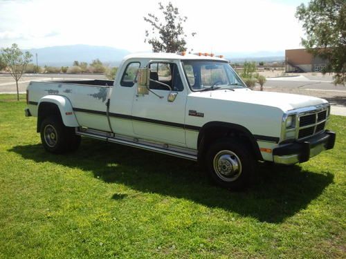 Hello, we are selling our 1993 Dodge Ram 3500 4x4 Cummins Turbo Diesel. This truck is a one owner with 108,xxx original miles. Maintenance records from day one. The Cummins engine runs very strong, no modifications what so ever. Everything works on the truck, power windows, locks, cruise control. and ice cold a/c. It still has the original stereo and owner manuals. The interior is in great shape, no tears, non smoker. The tires are almost new with plenty of tread left. The automatic transmission shifts great and the 4x4 works great as well. It is equipped with an exhaust brake and air suspension for a smoother ride while towing. We have the original power mirrors that also go with the truck. As you can see it still has the original paint from Dodge. Dash is absolutely perfect and comes with a dash mat. Absolutely no rust at all. The truck runs great, yes it is very loud and rides rough when empty, so if you are looking for a quiet smooth riding truck this is probably not the truck for you. If you need a strong work truck to pull a heavy load then this is it.