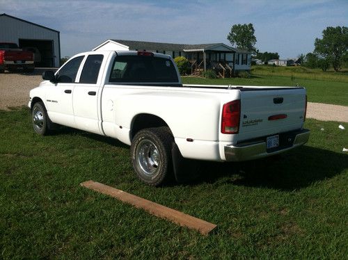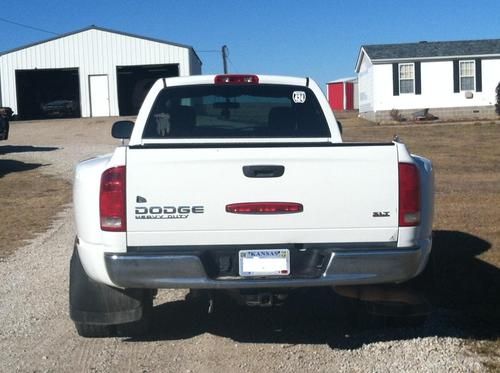 I have a 2003 Dodge Ram 3500 SLT Quad Cab V-10 White 2wd 5speed Manual Dually For Sale. I am the second owner. I purchased it used in 2008 when it had around 50K miles. It has a goose neck ball hitch in the 8' bed as well as a receiver hitch. It has all that would be expected in a Dodge Ram such as this: A/C, cruise, AM/FM CD, Power Seats, Power Windows, etc. The interior is Charcoal Gray Cloth. It has a factory towing package as well. This truck will pull anything and has substantial power. This is a solid vehicle and has been taken care of exceptionally well from a mechanical standpoint. It has never been wrecked, has a clear title, and I have the title in hand. It is currently sporting Hankook Dynapros with 50% tread remaining. It does have a little external wear and tear, but much less than would be expected from a 10 year old truck! It has a clear title and I would rate it's overall condition as "GOOD" according to the KBB guidelines. I've done my best to show the few dings that it has with the attached photos. It has a small dent on the right front fender, a small dent on the left rear door, as well as a small fold on the lower right portion of the tailgate. Please contact me directly and I would be happy to send more photos as you'd like! This vehicle is for sale with a local pickup, but would be willing to ship at buyer's expense. It would be your job to coordinate the shipping and pickup as well. I would not be against meeting you close to Wichita, KS or the surrounding area. I can be reached directly if you have any specific questions at 620-583-2304. Please read my feedback and bid with confidence! I would be more than happy to show the truck in person or find a time when we could meet so you could see it for yourself to inspect. I'm selling it because I have two other Ram 3500s, that's how much I like them, and the wife says this one has to go. Thanks for looking!