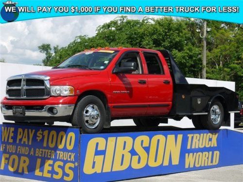 WWW.GIBSONTRUCKWORLD.COM*2005 Dodge Ram 3500 SLT Crew Cab Dually Flat Bed Cummins Diesel 5.9L* Carfax 1 Owner 1 year REAL FREE BUMPER TO BUMPER WARRANTY honored anywhere in the United States with our exclusive 15 DAY RETURN/EXCHANGE POLICY! That is how confident we are in our trucks! Do not make a $3K+ mistake, B4 you buy a used truck demand to see shop bills & have the truck inspected by a 3rd party! Riding on a set of like new Firestones, $750 gooseneck hitch, power seating, CD player, tilt steering, cruise control, sliding rear window, keyless entry with alarm, power windows, power mirrors, power door locks*Gibson is the only dealer that gives a REAL FREE 12 MONTH BUMPER TO BUMPER WARRANTY VALID ACROSS THE UNITED STATES, 12 MONTHS FREE MAINTENANCE ($1,000 VALUE!) FROM OUR 23 BAY SERVICE DEPARTMENT AND OUR EXCLUSIVE 15 DAY RETURN/EXCHANGE POLICY! It sounds too good to be true, but it is true! We will pay you $1,000 if you find a better truck for less, Gibson Truck World is Nations ahead of the competition! AT GIBSON TRUCK WORLD AN EDUCATED CONSUMER IS OUR BEST CUSTOMER**Repair Description: Total Invested = $573.03*10 Mile Road Test, 135 Point Inspection, Lube, Oil & Filter, Serviced Transmission and Replaced Fluid & Filter, Replaced Wiper Blades, Balanced and Rotated Tires, Alignment, Replaced 3rd Brake Light BulbBattery Condition Test : Good, Alternator Condition Test : GoodLabor time quoted by All Data Universal ShopKey Gibson Truck World in Sanford, FL has the lowest price for used trucks period! Gibson specializes in pre-owned Ford trucks, Dodge trucks, Chevrolet trucks, GMC trucks, Jeeps and SUVs. Gibson Truck World sells, ships trucks across the country & worldwide. We have a large selection of F150, F250, F350, F450, F550, RAM 3500, 2500, 1500 Chevy or GM 3500, 2500, 1500 quality pre-owned pickup trucks.