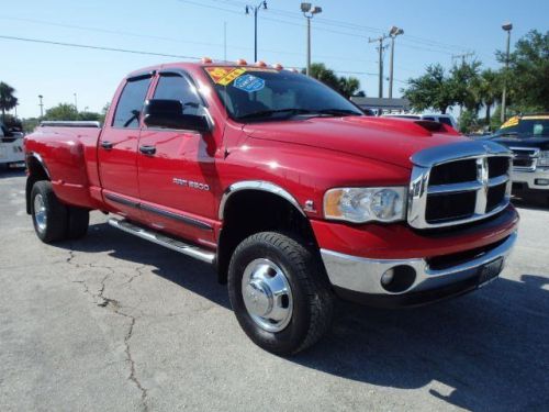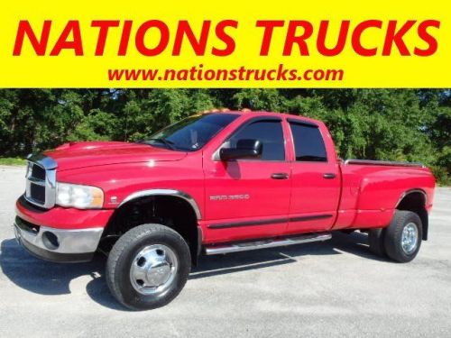 2005 Dodge Ram 3500 SLT Crew Cab 5.9L Cummins Diesel Dually 4x4, this eye catching one-ton Ram features a flawless CARFAX report and she comes fully equipped with a bedliner, chrome bed rails and nerf bars, towing package, keyless entry, power windows, power doorlocks, power mirrors and seats, cruise control, tilt steering wheel, Pioneer CD player and much much more! DEMAND TO SEE A CARFAX BEFORE YOU BUY ANY USED TRUCK! For a better truck at a better price visit Florida's new truck alternative Nations Trucks today and let us help you find the perfect truck for both you and your budget!*see dealer for details All certified Nations Trucks have been fully inspected and serviced and come backed by our ONE YEAR BUMPER TO BUMPER WARRANTY! We look forward to earning your business, please call 866-535-5519 to schedule your test drive or visit us anytime at www.NATIONSTRUCKS.com