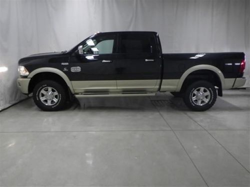 Chrome grill, side view mirrors, and handle bars. Fog lamps, front tow hooks, roof clearance lights, side step running boards, fender flares, 18 inch polished aluminum rims, tinted windows, rearview camera, rear sensing system, and a rear trailer hitch. 4DR. 4WD. Engine is a 6.7L Cummins Diesel with an automatic 6-speed transmission. External color is a two toned Brilliant Black Crystal Pearlcoat and Adobe. Interior contains Premium Genuine Leather seating over front bucket seats and rear bench seating. Power mirrors, locks, and windows. Additional features include: Ventilated seats, heated seats, rear heated seats, heated steering wheel, trailer brake controller, rubber floor mats, CD player, Bluetooth, auxiliary input jack, USB port, dash mounted touch sensitive screen, and on-wheel audio/cruise controls.