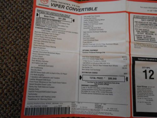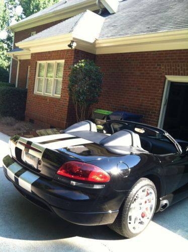 I have the "Original Window Sticker" and "Original Glove Box Manuals" ! This car when new had a sticker price of $89,640 !! Born Viper Black with Matching Suede and Leather Interior, Black Soft Top and for the true Viper look it has the Factory Silver Stripe Package ( a $3000.00 option ). The owner purchased a custom made fiberglass Landau Cover that hides the soft top when it is down, this is a very cool option for these cars!! See photos please. It also comes with the custom Viper Front Bra too!! The "Original Viper Floor Mats" are still in the original bag, they have never been used!! It has just been serviced at 30,373 miles. Michelin Pilot Radials are front and back. I have owned many Vipers since they first came out and this is the nicest one owner Viper I have ever had!! This Viper looks like it is only 1 year old, it is that nice!!
