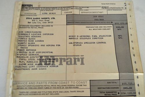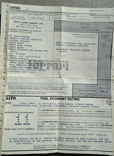 1981 Ferrari 308 GTSI with 50,046 original miles. Purchased from the original owner. The owner was a non-smoker and had the car garage kept, and professionally maintained via Ferrari factory mechanic. The car is an alloy V8, has a removable hard top, air conditioning, am/fm cassette player, and security alarm system. The Ferrari has had a complete schedule of services including all belts changed at 49,661 miles, and a new clutch installed at 47,622 miles. This car is in exceptional condition with few minor paint chips, a small separation on driver side seat. A tight car both inside and out that runs excellent. Original books, original tool kit, original window sticker and records come with the car. Also included are extra timing belts.