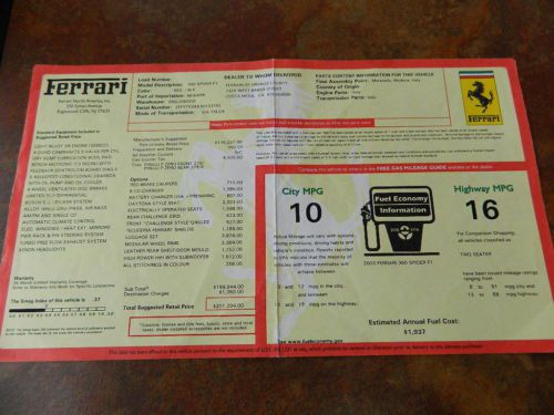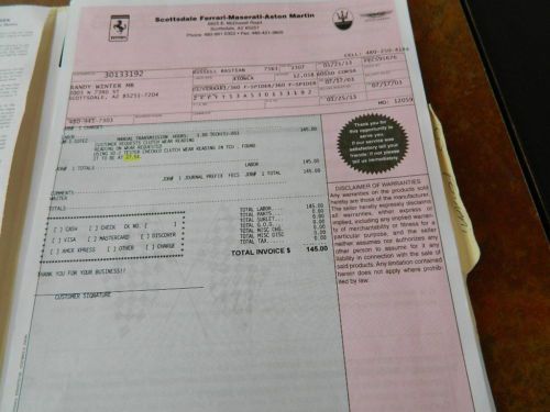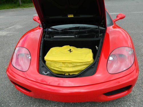 You are bidding on a Red 2003 Ferrari Spider with F1 transmission. Car was fully serviced at 12,000 miles (see picture of repair order) as follows: 1. Full timing belt service. 2. Brake Flush and new brake fluid. 3. Coolant flush and replacement. 4. Oil change. 5. Convertible top serviced. 6. New front and rear brake pads. Tires have less than 3,000 miles and were replaced with original Pirellis (see picture of invoice). No bargain basement tires here. This ferrari is in outstanding condition and one of the finest 360s in circulation. The color combination is striking, When looking for a Ferrari as a buyer I look for the following: 1. Red (A ferrari has to be red). A Red Ferrari has the best resale value. 2. Daytona seats (inserts a big plus). 3. Modular wheels. 4. challenge grilles/grids front and rear and 5. Scuderia Ferrari Shields from the factory, not after market stick ons. Way to tell is the factory fenders are indented to accept the shields. This Ferrari has all the above options and more including: Red brake calipers, six CD changer, power seats (both), leather rear shelf/door mold, high power Hi-Fi with subwoofer, and all stiching in color. With this Ferrari included is also the luggage set and garment bag which you don't see very often. The only thing that is not included as shown on the window sticker is the battery (trickle) charger. However, the prewiring is there as shown on sticker. This car stickered at $201,294 (see picture). If you have been looking for a Ferrari and don't want to worry about maintenance for a long while, look no further. All you need to do with this car is to start it up and Go!!! As many have learned when it comes to exotics a "cheap deal" usually turns out to be the most expensive one. With the first repair, you'll wish you had purchased the more expensive, well maintained car. The car does have some chips, one small scratch (see picture) and a scrape underneath the front (most sports cars have this) from driveways. I have chosen not to repair it as depending where the new buyer lives it may not be feasable to repair as it will happen again, plus it's under the car. Another thing to keep in mind when shopping for a 360, is to make sure the taillights are not bubbled. If so, it means that there was alot of heat (engine) under the hood and that being the case I would take my money elsewhere. The taillights on this ferrari are as straight as when they left the factory. The Tubi exhaust (a must on a 360) was installed by Ferrari & Maserati of Orange County (see picture). A clutch snap was performed at 12,058 miles by Scottdale Ferrari-Maserati-Aston Martin which showed wear to be at 27.5%. This of course meant that the clutch is 72.5% good. With this car driven easy I can't see the wear being that much different. So in summary, this car has been maintained from day one and is well documented (see pics). If you can find a Red 360 as maintained as this one for cheaper, buy it!! I am not interested in any trades except a 2012 SLS with the right options (carbor fiber in and out, B&O, AMG performance Suspension). I will email additional requested pictures to serious buyers, but please do not lowball me as the sale of this car is not a must. I will take the car a reasonable distance for a PPI to a reputable Exotic car dealership (preferably Ferrari) or a reputable Independent specializing in Ferraris. I will not take it to your neighborhood mechanic. Good luck bidding.
