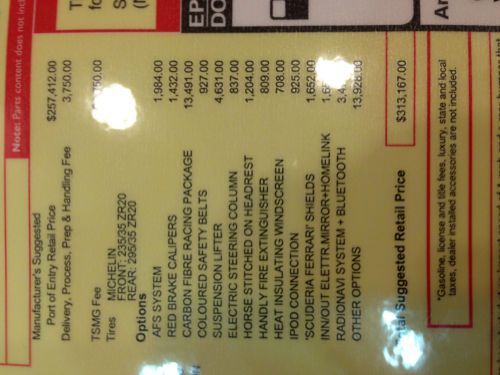 Options Include: Race Seats w Campingiora Red Stripe Red Stitching Red Stitched Cavalinos (Horses) Navigation w Ferrari IPOD AFS Headlight System Suspension Lift System Carbon Fiber Racing Package Fire Extingusher Yellow Tach Red Seatbelts (its all in the detail!) Heat Insulated Windscreen In/Out Homelink system Shields Rosso Brake Calipers Electric steering Column |