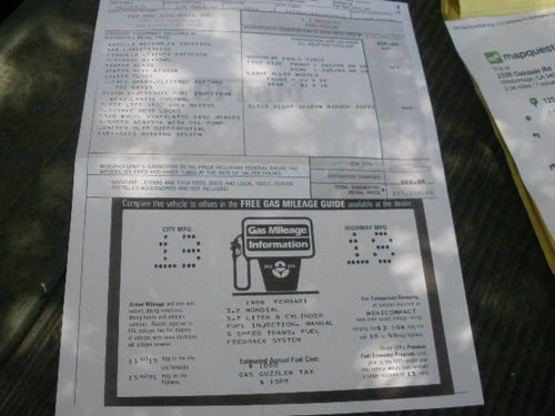 1988 Ferrari 3.2 Mondial Coupe. Red with Tan interior . Just One Local Owner since new . It was supplied by San Francisco Ferrari September 4th 1988. Comes with all the original books etc and even the window sticker.Even has the original issue California Pink Title. Paint and body are really nice , not perfect though. Interior is also very nice with no tears etc. The car runs and drives, starts promptly, shifts properly , good clutch and brakes etc . However, prior to us picking it up recently, it was stored for approx 2 years and not driven on a regular basis . Should be serviced etc before being put back into regular use. Please feel free to ask any questions during the auction, or, you are welcome to inspect/view the car anytime at our premises here in Burlingame California. We are located just 10 minutes South of San Francisco International Airport. We are happy to arrange Shipping Worldwide, or, Trucking Throughout The US at competetive rates. As with any 25 year old car, this one is Sold As Is , with No Warranty Offerred Or Implied. Winning Bidder should contact us within 24 hours of the auction ending to make arrangements to complete the sale. Please ! if you have any Negative Feedback, or , Zero Feedback , contact us prior to bidding or your bid may be cancelled . Pleas! only bid if you intend to buy! We report all "None Paying Bidders " to Ebay , No Exceptions. Thanks for viewing our auction !