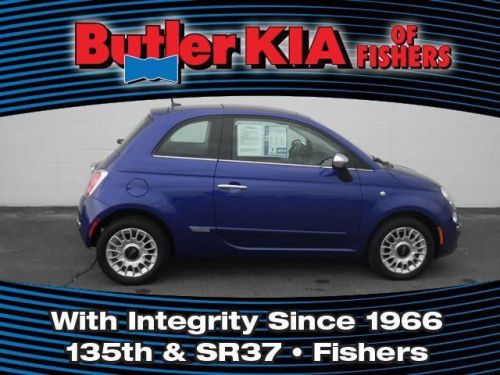 ABS brakes, Alloy wheels, Leather Trimmed Bucket Seats, Power Sunroof, and Power windows. One-owner! Low Mileage! Looking for an outstanding deal on a good-looking 2012 Fiat 500? Well, we've got it! This fantastic 500 is the fresh car with low miles and everything you'd expect from Fiat, and THEN some. This one also comes with a 12 month 12,000 mile powertrain warranty at no extra charge to you call Butler Kia of Fishers today! This one will not last long at this price 888-860-9907. Everyday at Butler is a SALE Day!! We believe in selling the right car to the right person at the perfect price. We also offer our customers a no pressure sales environment where you can make car buying FUN! The Butler Auto Group is a Family Owned and Operated chain of dealers that has been doing business with Integrity since 1966. Come by and meet us and see why Nobody Beats a Butler Deal!