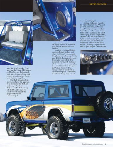 Exterior: Paint and prep work are of the highest quality available. Lots of Pearl and clear coat on this truck! There is no rust, in fact a good portion of the body is fiberglass saving weight and durability. All rubber and trim was replaced, and a complete racing certified roll cage was mounted to the frame. Five point harnesses for both seats are included as well as lap belts for the backseat. Truck has a top-of-the-line wench with remote control, custom lighting, custom tire rack. Windowsills were rebuilt to include one piece of glass for a cleaner look. Wheels and tires are of the best quality and fit the truck well without being over-sized. There is a 2-inch body lift with a 2-inch suspension lift. This truck handles well and has a low center of gravity. Truck can easily be a daily driver and is stable on the road. Interior: Truck has a customized dashboard – as seen in the photos. All gauges and switches work. Seats are competition grade and are free of scratches and stains. Some of the other upgrades include; top-of-the-line covers that are clean and rip free. Five point harness, custom racing wheel, absolutely outstanding stereo system with (4) six-inch speakers and a 10 inch sub powered by (2) 250 Watt amplifiers. The black carpet is high-grade with perfect installation and is also stain free. Engine: This motor is a 302 V-8 HO. It has excellent power without sacrificing reliability. Some of the options include the following: high-rise intake, four barrel carburetor, ceramic headers, upgraded ignition system, dual batteries with dual charger, aluminum radiator and chrome valve covers. The engine compartment on this truck is completely dirt and oil free. Suspension: Very clean undercarriage and is show ready. All components are painted or coated and look new. Custom differential cover on the front along with completely rebuilt drive train to new specs or better. Custom roll cage is bolted to the frame with no welds present. Dual exhaust keeps the truck sounding good but tucked away nicely. Again nothing is covered up on this truck. THIS BRONCO WAS BUILT WITH THE ATTITUDE OF “GOOD ENOUGH ISN’T GOOD ENOUGH.” IT WAS RECENTLY FEATURED ON THE COVER AND CENTER FOLD OF BRONCO DRIVER MAGAZINE. EVERY THING IS NEW ON THIS BRONCO. ONLY ABOUT 375 MILES HAVE BEEN PUT ON SINCE THE RESTORATION. WITH $60,000.00 PUT INTO THE BRONCO ADDITIONAL FEATURES: FRAME OFF RESTORATION FRAME SANDBLAST EVERY THING STRIP AND REFINISHED EACH INDIVIDUAL LEAF SPRING POWDER COATED ENGINE REBUILT TO HIGH OUTPUT PERFORMANCE SPEC REBUILT BOTH DIFFERENTAILS, TRANSFER CASE AND BOTH DRIVE LINES REBALANCED BOTH DRIVE LINES EVERYTHING STRIPPED DOWN AND POWDER COATED SHOW QUALITY CHASSIS FIBERGLASS BODY 2-INCH BODY LIFT 3-INCH SUSPENSION LIFT RACE CAR ROLL CAGE SCULPTED TO FIT THE INTERIOR AND TIED INTO THE FRAME BEARD SEATS WITH THE 5 POINT RJS HARNESS CD PLAYER IN ROLL CAGE2 JL AUDIO AMPS 4- 61/2 INCH JL SPEAKERS 1 10-INCH JL SUB IN CUSTOM MADE FIBER GLASS HOUSING NEW DASH L.E.D TELL LIGHTS BRIGHT BLUE HALOGEN HEADLIGHTS POWER WENCH with REMOTE CONTROL REMOVED THE HINGE ON FRONT WINDSHIELD REMOVED WING WINDOWS ON DOORS AUTOMATIC WINDOWS |
