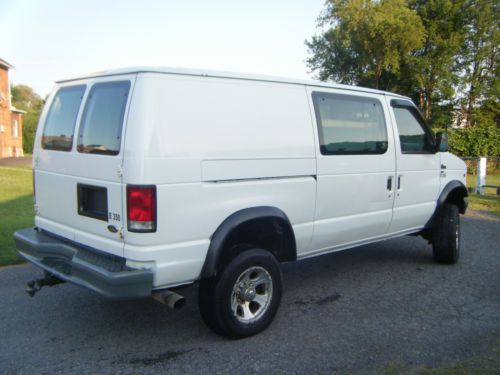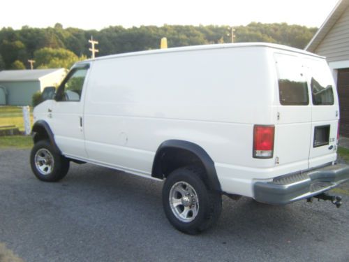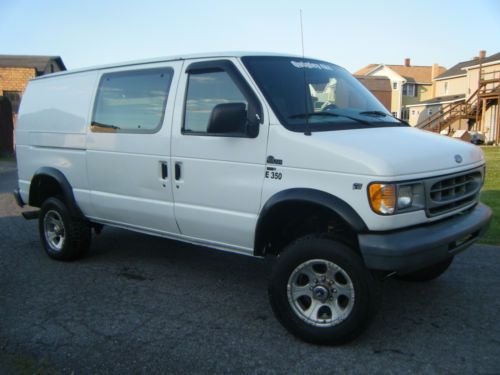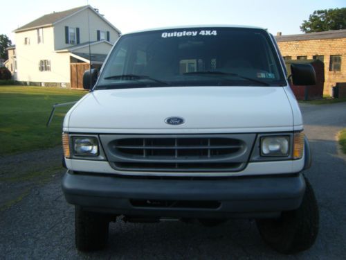 You are looking at a 2000 Ford E-350 Utility Cargo Van with a rare Quigley 4X4 conversion. Quigley is a company that takes factory new vans and trucks and puts a 4X4 conversion on them. It has a front axle and differential, upgraded brakes, 17" wheels and tires, upgraded suspension with an approximate 3.5" lift, and a larger fuel tank. This is a utility van that will really make it anywhere for you. It has the stock Ford 5.4L V-8 Engine with an automatic transmission. The van runs and drives very good, and the 4-wheel drive works great. It's a 2 passenger van with a cage and door between the cab and cargo area. The cargo area is set up with shelves and tool boxes. It has cold A/C, AM/FM stereo, and cruise. It has average wear for the year and miles with some minor scratches and dings (one larger ding on the passenger side door)- see pics. There is little to no rust, no holes or damage and it looks good underneath. It looks to us like it has had some minor paint work. It has a good PA inspection until Jan 2015. This 4X4 conversion is rare and costs as much as $12,500. There is a lot of information about the 4X4 upgrade at Quigley4X4.com. If you're looking for a rare 4X4 Ford utility van at a great price, bid now, no reserve!