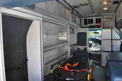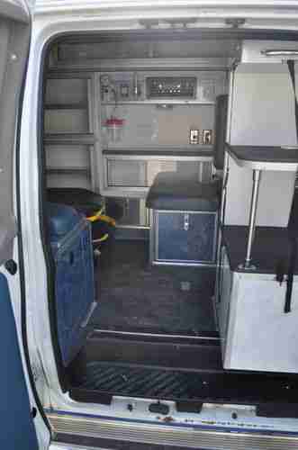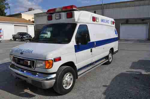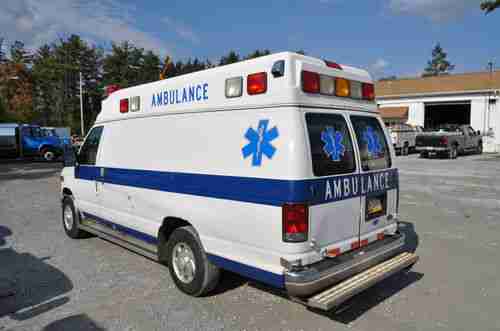 I am selling a 2003 Ford E_350 Ambulance. The exterior color is white and with a blue stripe. You will note one fender has been replaced where the vehicle was struck in a parking lot. There is some rust over the windshield as well as some surface rust over the rear wheel well. All the doors operate properly. The ambulance mod is in perfect working order, i.e the suction works, the oxygen system is operable. The interior lighting works as it should, there may be a bulb or two out in the interior. The tires are good, and the vehicle shifts runs and drives well. The vehicle has one bent rear spring and it will need new batteries as it has been sitting for a few months. The ambulance certainly has life left as an ambulance or you could turn it into a camper or worktruck. The ambulances front and rear AC and heat worked perfectly when it was parked.