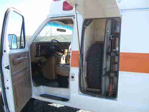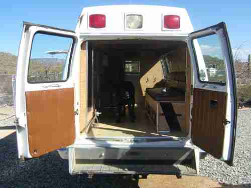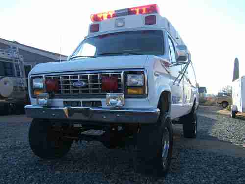VERY RARE -- Off Road Capable 1985 Ford Econoline E-350 1 ton 4x4 EXTENDED LENGTH AMBULANCE Collins truck body mfg. w/4" additional lift. 460 (7.5L) big block, heavy duty C-6 automatic, manual locking hubs, divorced transfer case, PS-PB, front & rear A/C I purchased this ultra cool beast from an AZ mountain community fire department just north of Phoenix (ground pumice used on roads in winter --not salt -- pumice does not corrode metal). Original title is still in the name of the Fire Dept. and has been notarized for release and is ready to transfer to new owner. All emergency FLASHING LIGHTS - SIRENS - HORNS - BUZZERS - PA SYSTEM - INTERIOR LIGHTS - EXTERIOR LIGHTS - KC FRONT SPOT LIGHTS - everything still connected and STILL WORKING GREAT. Low miles--only 82,100. Please see 4 wheel drive transfer case control and dual battery control on floor near driver. Battery controler switches from single to both batteries, or to complete disconnect. Batteries are 6 months old. Heavy duty alternator provides extra charging and running of all lights and equipment. No cracks in dash, NO RUST anywhere in body. Minor paint touch ups here and there but almost no body damage. Please see photos as I've tried to show any and all damage, but it is very hard to see (left front dent & grill chrome delamination at cowl, and rear step). Tires (35"x12.5x16's) are 50% tread at best. I think 37's would fit with no problem. Polished aluminum 16" faux bead lock rims are very nice. Includes high lift jack and spare tire (see photos). Please note special area behind driver (lockable with key) for spare & high lift jack storage---this seems to confirm story from fire department that this was a special 4x4 only ambulance body equipped for high ground clearance, hence this conversion was performed prior to delivery to fire department when new. I have never seen another 4x4 Econoline set up like this. See letters section below. Dual fuel tanks, and both tanks and sending units are operational with switch at dash.I added a tow hitch receiver under rear step but this is NOT directly attached to frame. The steps are frame mounted and this setup feels plenty secure, but I would use only for towing small lightweight motorcycle style trailers or similar. FLAWS THAT I CAN SEE: I can hear an exhaust leak at one side manifold. Some oil drips at various places under motor. Broken plastic at passenger side above rear bench. Linoleum flooring beginning to wear out. Small rip in naugahyde backrest of bench seat in rear. Front driver seat material has a few splitting seams. No ceiling water stains or any leaking evident from roof extension. This is a very clean and sano rig. Please note that there is A LOT of interior storage: multiple and various cabinets (doors close tightly and do not rattle), underneath both rear bench and jump seats, and inside spare tire well behind driver. There are numerous interior high intensity lights in ceiling. Hi intensity exterior flood lights at front, rear, and both sides. Sliding interior door is a bit sticky, but all other doors operate smoothly and close tightly. Interior & exterior power supplies are numerous. There appears to be some oxygen lines and valves still connected here and there, with gauges. Antenna for CB or two way radio still present on roof, with wires running to dash tucked in and out of sight. This van drives very tight---excellent power and great brakes. Very tight steering too. No rattles inside when driving. This is a really good rig that's a blast to drive. You'll be the only kid on the block with one of these, that's for sure. This is a super cool old-school style 4x4 that's in remarkably good shape. This would make a great 'bugg-out' van, off road or desert camper van, or mobile motorcycle repair? Still has most of the gurney mounts attached so due to it's low mileage this could still be used as an ambulance as well. There are endless opportunities for the creative mind. This thing is big and TALL. It's almost 9 feet to top of light bar so keep that in mind. Please remember that this has always been an Arizona Fire Department operated and maintained truck. These guys keep on top of all maintenance issues, so it's safe to assume that this truck has always been well taken care of. My auction rules are simple: PAYMENT via cash in person, personal check, cashiers check, bank wire transfer, etc. Truck does not leave my posession until all purchase funds have cleared my bank. NON-REFUNDABLE PAYPAL DEPOSIT ONLY of $250.00 and I will NOT accept payment of truck in full via Paypal. If deposit is not paid for within 4 days then I will file an unpaid item dispute through ebay, and if truck is not fully paid for within 8 days from end of auction buyer loses their right to the vehicle. I'm happy to make exceptions to these rules as long as we discuss first. So PLEASE, only bid and buy if you fully intend on FOLLOWING THROUGH WITH YOUR PURCHASE. Thank you for reading and agreeing to these terms. Shipping is responsibility of buyer. Located in New River, AZ 85087 --- easy on / off freeway for your shipper. PLEASE ASK QUESTIONS and feel free to call me if you need more info---thanks--Az-Mike 623-465-0636 -------------------------------------------------------------------------------------------------- Thanks for looking --- AzMikesVMXbikes --- search Lots more VMX bikes and parts---check out my other auctions. Will work on almost all of your VMX AHRMA AVDRA vintage dirt flat track speedway enduro trials bikes moto x moto-x bikes.