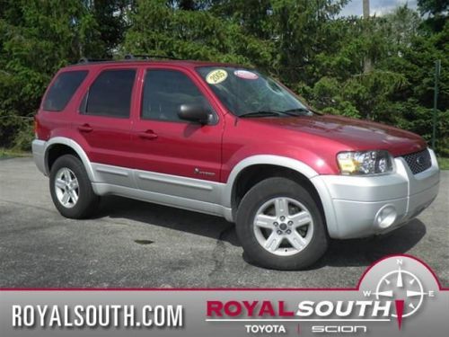 PERFECT OWNERSHIP HISTORY~~~1-OWNER & CLEAN CARFAX~~~Local Trade for Prius V~~~'HYBRID w/ LEATHER & NAVIGATION'! If you're looking for a HYBRID vehicle with 4WD and luxury upgrades, this would be it! This 2005 Ford Escape Hybrid was just traded in by the ORIGINAL OWNER for a brand new Toyota Prius Hybrid V, right here at our dealership. It has one of the best vehicle histories we've seen. A legitimate 1-OWNER VEHICLE with a perfect carfax, so you can buy with confidence. What's more... ******This Escape HYBRID is being sold as a ROYAL CPO VEHICLE, meaning it has been inspected by our factory-trained technicians, PASSED, and now comes with a WARRANTY included in this price. The warranty is valid at any new car dealership (Toyota or otherwise), as well as any ASE Certified Repair Center. That means you can buy with confidence!***** It is packed with upgrades, in addition to the HYBRID SYSTEM (nearly 30 MPG) and 4WD SYSTEM, drivers will enjoy: LEATHER/POWER SEATS, MOONROOF, **NAVIGATION SYSTEM**, Upgraded Sound System, Alloy Wheels (not hubcaps), and TOW PACKAGE. The perfect blend of 4WD ability and power with ECO-FRIENDLY Ability, Reducing your Carbon Footprint, and Money Saving MPG! This car sparkles! CARFAX 1 owner and buyback guarantee*** 4 Wheel Drive!!! This really is a great vehicle for your active lifestyle!! Gets Great Gas Mileage: 29 MPG Hwy... This Hybrid Vehicle has less than 91k miles!! Safety Features Include: ABS, Passenger Airbag, Front fog/driving lights...NICELY EQUIPPED: Power locks, Power windows, CVT Transmission, Air conditioning, Cruise control, Tilt steering wheel, Power mirrors, Power seats, 133 hp horsepower, 2.3 liter inline 4 cylinder DOHC engine, 4 Doors, 4x4, Fuel economy EPA highway (mpg): 29 and EPA city (mpg): 33, Tachometer, Trip computer, Rear wiper, Clock - In-radio display... Most of our Used Vehicles come with a 3 month / 3,000 mile warranty, FREE of charge!! All purchases give you FREE CAR WASHES every Saturday for the life of the vehicle! Thank you for considering Royal South. Disclaimer: All prices listed are believed to be accurate; we don't warrant or guarentee listed price.
