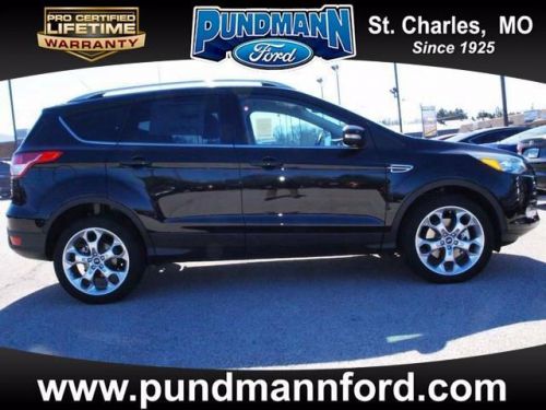 Call Now, 877-563-9167 Only At Pundmann Ford!! Our 2014 Ford Escape Titanium AWD shown in Tuxedo Black is the top dog! The 2.0 Liter EcoBoost offers 240hp on demand while paired with a 6-Speed Selectshift that helps bring in an impressive 28mpg. Torque vectoring control gives you awesome response and agility in the turns and believe me it handles like a dream. Chrome exhausts and accents, rear spoiler and fog lamps add to the sporty feel plus the sweet Titanium badge. Escape is environmentally friendly using recycled and earth friendly materials on it's interior while still retaining a luxurious modern feel. Voice-activated MyFord Sync w/ RCA inputs for gaming systems and SD card reader, ambient lighting, a leather wrapped steering wheel and shift knob. Enjoy heated leather trimmed seats and unique accents that make you feel like a rock-star. Passengers have plenty of room to relax and ride in comfort while plugging in their devices to their own power points. Escape is big on safety with six airbags, Roll stability control, SOS post-crash alert, tire pressure monitoring and traction control all ensure your safety on the road. MyKey lets you customize features such as speed and volume controls for the young drivers of the family. You have chosen a great versatile SUV with the new 2014 Escape Titanium! Once behind the wheel you will know this is one of the most intelligent vehicles on the road today. Print this page and call us Now... We Know You Will Enjoy Your Test Drive Towards Ownership Pundmann Ford in St. Charles, MO, is proud to be an automotive leader in our community. Since opening our doors, Pundmann Ford has maintained our solid commitment to our customers, offering the widest selection of cars and trucks and ease of purchase.Pundmann Ford, Since 1925