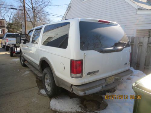 Excellent condition NON-Molested ford excursion 4x4. Totally stock. has the very dependable 7.3 powerstroke diesel. has new water pump tires front brake pads hoses calipers and rotors. also has fresh oil change with Fram ultra guard filter and Rotella 5-40 Synthetic oil. has new lund color matched floor mats thruout the ENTIRE truck. Everything works on this Excursion EXCEPT: passenger rear lock(think it has something to do with child safety lock. Driver front heat stopped working but light goes on and rear window wash. think hose has a crack somewhere. besides that everything works on this truck. seats in good shape passenger side has 3/8 size small tear that u can not notice unless pointed out. interior in great shape. lil dirty because of snow but will be spotless upon sale. averages 12mpg around town and had as much as 17.8 on long run was best ever with 2 adults and 4 kids. plenty of room. 3rd row seat like brand new. dont even think it was ever used.Have extra oil filter to go with truck. there is one small ding on passenger side front bumper which i will be adding more pics soon. All in all it is a great truck and runs awsome starts up everytime even in coldest of weather. Some mornings here have been -10 and started right up with minimal smoke for few seconds then cleans right up.Also truck has REMOTE START. i have 3 keys w/ fobs to go with truck. ALSO OIL PAN IS IN PERFECT SHAPE NO RUST OR LEAKS.TRANS HAS NEVER BEEN REBUILT FOR IT IS ORIGINAL AND SHIFTS PERFECTLY ALSO THIS EXCURSION WAS UNDERCOATED BY PREVIOUS OWNER. SO FRAME AND WHEEL WELLS HAVE NO RUST. TRUCK CAME OUT OF ARIZONA AROUND 100K THEN SPENT REST OF ITS LIFE ON EAST COAST. I AM 3RD OWNER. For sale locally so reserve right to end early. any ?'S feel free to ask. thanks