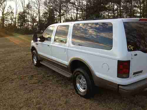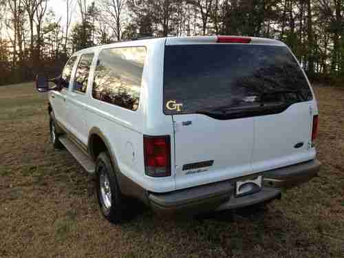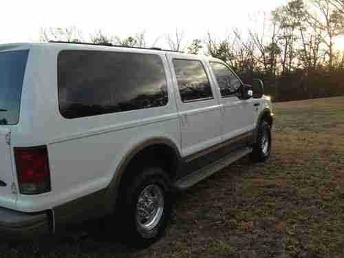 You are looking at one nice 2003 Excursion Eddie Bauer 4x4 Diesel! Probably the best or one of the best towing SUV's on the planet. I have had this truck since new in 2003. This was my wifes vehicle and has always been garaged. I changed the oil every 5,000 miles using only Ford diesel oil, and the fuel filters at the same time. I replaced the shocks and the tranny fluid and filter at 100,000 miles, and the air filter and tranny filter and fluid at 150,000. , I just replaced both batteries last month. The tires are brand new $900.00 Michelins with 200 miles on them, and the original spare has never been on the ground. The paint and interior are in excellent condition no burns or stains in the interior and no scratches or dents on the exterior. The drivers arm rest has a small tear on top. The front bumper has some scratches on it from where the paint chipped off. All the lights, windows, and electronics work. I am selling this truck because my Father in Law just passed away and my wife and I received 2 vehicles from his estate. This Excursion has never had a pet or smoker in it. We used it as a family vehicle, and to occasionally tow my Harley trailer to events. It has been a Great vehicle for us.