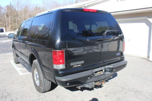 For sale is a Black Limited Ford Excursion, 6.0L turbo diesel, with 173,500. We are currently using this vehicle, so mileage may change. Overall this truck is in very good condition. Mechanically there are no issues, with everything in working condition. We have an excellent maintenance program provided by our own in house mechanic. There have been seveal uprades to the engine with all service records of repairs done. The interior is in excellent condition with only some wear to the drivers seat bottom. Exterior is in good condition with no major dents, only one area of clearcoat flaking on front driverside fender, which is shown in one of the photos. All other scratches and blemishes are minor due to normal use for age and miles. Tires are approximately 50% on the front and 25% on the rear. We are selling due to an age requirement for our business. This truck is in above average condition for age and mileage and has had several thousands of dollar engine upgrades. Any questions call Chris at (570)274-7616.