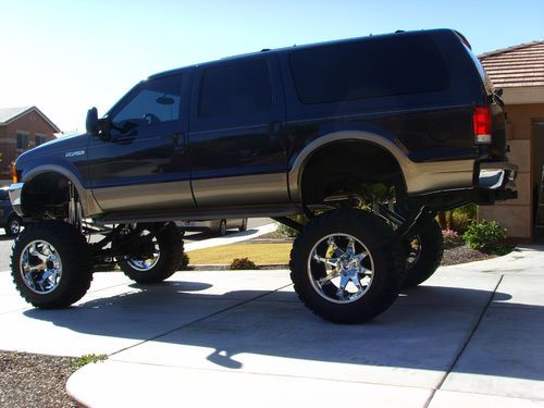 2000 Ford Excursion with 20” + lift, 4WD, Limited edition, automatic transmission, 10 cylinder gasoline, loaded with options, air conditioning, power windows, power locks, heated 6 way power seats, cruise control, tilt wheel, anti-lock brakes, driver & passenger air bags, tan leather seats, 6 disc in-dash CD player, blue exterior with tan bottom, 20” lift with triple chrome, 4 way adjustable shocks on all 4 corners, cross over steering, new gears, custom exhaust, Hughes built transmission and transfer case with the best billet aluminum towing converter, triple disc H.D. brakes, Tow Master power mirrors, runs and drives great, too many options to list, must see to appreciate, definitely a one of a kind.