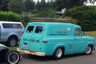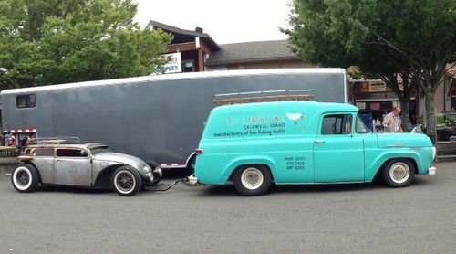 This is a 1959 Ford panel sporting its original turquoise paint that has had any rust removed with patch panels.This truck was found out in Idaho where it was a company rig for Glen Evens Inc.back in the day,the truck was picked up by Mr Chubs Woody Shop where the front end was disassembled, the firewall and inner fenders were painted and all new hardware installed,it was front clipped and now has a torsion bar front end setup with disc brakes and power steering and a 302 installed backed by an AOD trans running back to an 8in rear end,the panel also has a new windshield and seal,new tires,a 56 steering column with the column shift and a bench seat,6ft CarPac luggage rack and a frame mounted reciever.The truck starts every time on the first turn over of the engine and has never let me down.It could use door seals and maybe some Dynamat,other than that its a great looking truck that was well built.I reserve the rite to end the auction early if the reserve is not met due to truck being up for sale locally. Thanks for looking Tom .360-915-2274