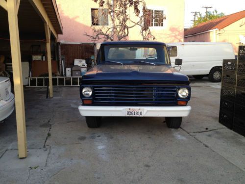 Up for sale is a 1967 Ford F250 with a non matching numbers 390 V8 and a a four speed manual transmission.This is not a show truck by any means but it runs well and has no problem hauling.It has no options meaning it has no A/C, no power brakes, and no power steering. The exterior is in good shape very little to no rust as it has spend most of its life in southern California it has not been in any accidents and it has no dents, the paint is not great but decent and the interior is not of the highest quality but there are no rips or tears. About the only thing that this truck needs to be a daily driver are new tires. If you have any questions please dont hesitate to ask.