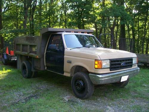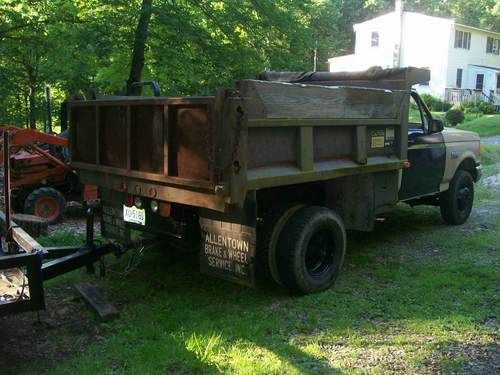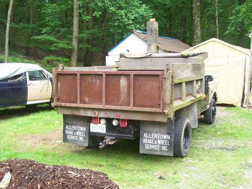 F450 DUMP WITH 120k MILES, TIRES 50%,INTERIOR OK. PTO DRIVEN DUMP WORKS LIKE IT SHOULD. STRONG 7.3 DIESEL. WITH 5 SPEED OVER DRIVE. DUAL SWITCHED FUEL TANKS. BUILT IN HITCH. GOOD FOR SITE CLEAN UP OR GENERAL LANDSCAPING. NEW RADIATOR, CLUTCH, EXHAUST, INJECTION PUMP, GLOW PLUGS, INJECTORS, FILTERS, GOOD BRAKES. TRUCK SOLD AS IS NEEDS SOME WORK- PIN IN DUMP, CAB HAS SOME RUST - NEED MOUNT AND CORNER REPAIR, PAINT DOORS, WIPER SWITCH, TRANS WHINES BUT WORKS. REAR WINDOW NEEDS REPLACEMENT (I HAVE THE WINDOW), WINDSHIELD HAS CRACK. I USE TRUCK THE WAY IT IS FOR PULLING TRAILER AND HAULING CHIPS AND MULCH. PICK UP IN GLEN GARDNER NJ OR WILL DELIVER LOCALLY. KARL 908-346-2767