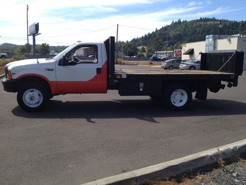1999 Ford F450 that has a great running best motor Ford ever made 7.3 turbo diesel that runs excellent. Truck has automatic transmission that shifts flawlessly. The truck has ice cold A.C as well. This truck is not perfect was a work truck but still a great truck that will last! The truck is straight on the cab with no major dents. Flatbed has hydraulic lift that works great! Lock box, Motor fires up every time and runs great! No check engine lights, has 171k miles, was a Ex Knife River truck that is a local company and regularly serviced, and maintained well! Please call me with questions at 541.301.6862 Buyer pays shipping or come pick up locally in Eugene, Oregon. Truck is sold in as-is condition. Has clean and clear title. This is a great work truck than can tow just about anything you put behind her! Bid with confidence!
