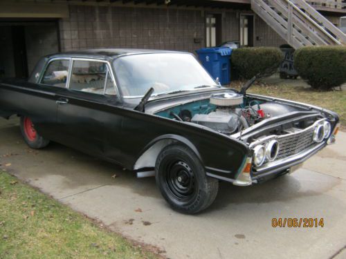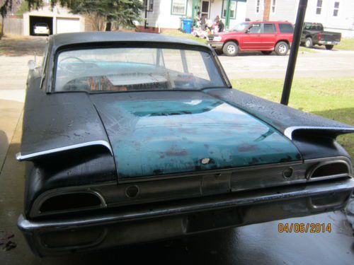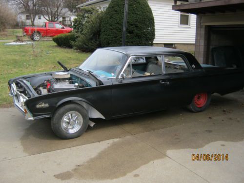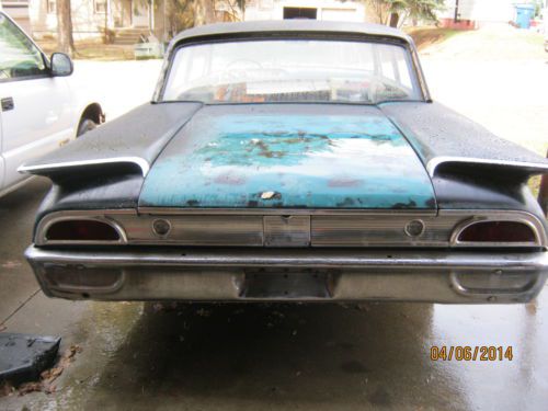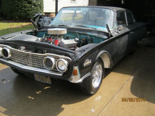 1960 Ford Galaxie 2dr.,460 c.i.,C6 auto,needs finished,runs and lot drives,needs radiator,needs most of the interior replaced,undercarraige is very solid (floors,trunk,frame and rockers) have no rust holes or previous repairs,body is solid with only minor rust in the rear quarters. I've accounted for about 75% of the trim and it is in good shape,I'm missing about 20 to 25% of it. Has some performance goodies,pretty much just bolt on stuff. The photos were taken this summer,and I hope to have time to post some more this weekend. There is a dent in the passengers door and on the top on the passengers side fin,those should be easy to fix,there's a dent in the roof on that same side were something's been dropped on it and it is on the body line on the right rear of the roof and may be a little trickier to fix right. I've been working long hours but will try to post close-up pics of any damaged areas,or I can also email some. I also have the front bumper,but it is pitted,and hood is cut for hi-rise intake.