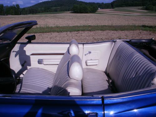The interior is also good. White leather; black carpet. The knobs on the rear window cranks are there, but not attached. Some light discoloration on the white leather; see interior photos.