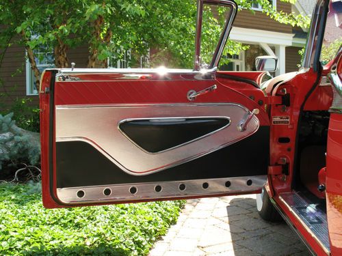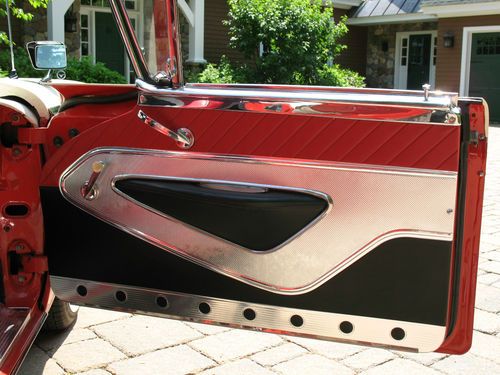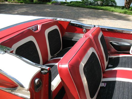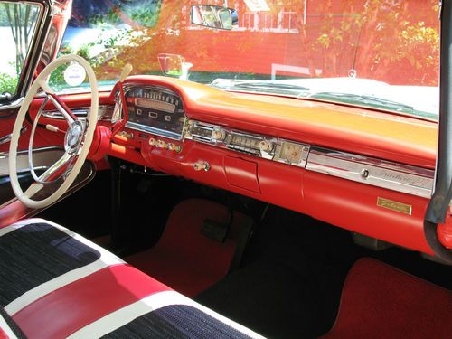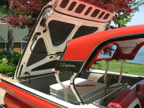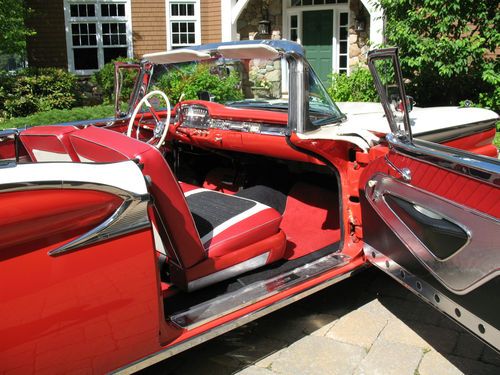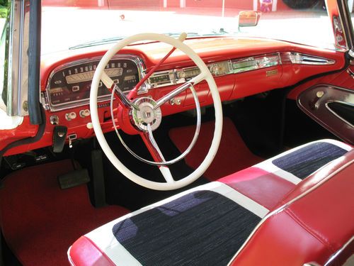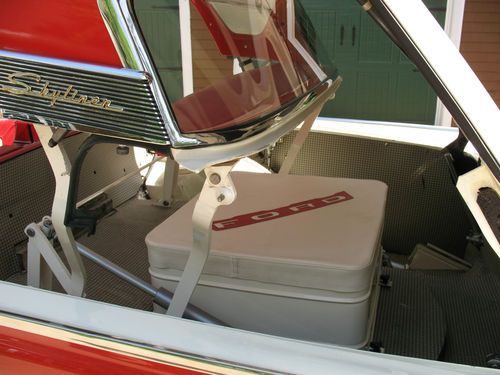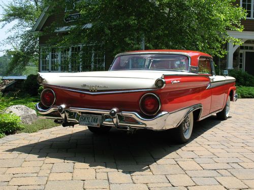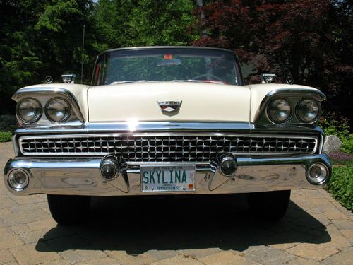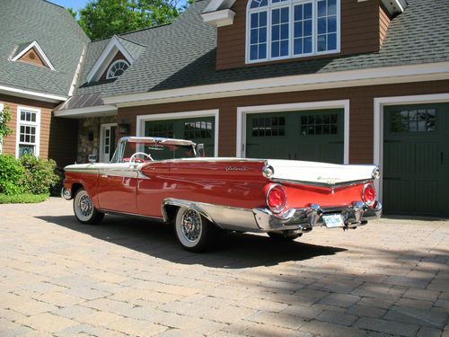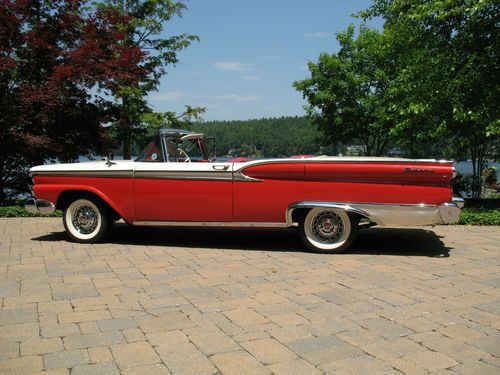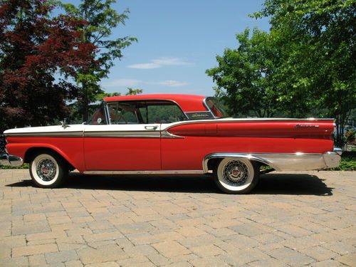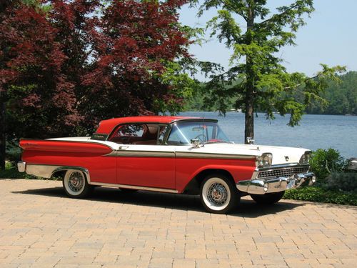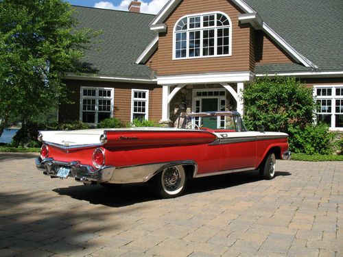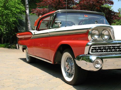 THIS IS A TOTAL BODY-OFF THE FRAME RESTORED 1959 FORD SKYLINER RETACTABLE. IT LOOKS AS BEAUTIFUL UNDERNEATH AS IT DOES ON TOP! THE ENTIRE BODY WAS REMOVED, AND THE FRAME WAS CLEANED, BLASTED AND REFINISHED, ALL NEW SUSPENSION INSTALLED, NEW BRAKES AND LINES, NEW SPRINGS, SHOCKS, AND THE ENTIRE DRIVE TRAIN WAS REBUILT. THE BODY WAS STRIPPED, PRIMED AND RE-FINISHED IN SPECTACULAR TORCH RED AND COLONIAL WHITE. EVERY PIECE OF CHROME AND STAINLESS WAS REMOVED, THEN POLISHED OR REPLATED TO A VERY HIGH STANDARD. IT HAS ONLY BEEN DRIVEN 400 MILES SINCE RESTORATION! THE CAR IS EQUIPPED WITH THE OPTIONAL 352 CUBIC INCH, 300 HORSEPOWER ENGINE, COUPLED TO A 3 SPEED CRUISE-O-MATIC, DUAL RANGE AUTOMATIC TRANSMISSION. IT HAS POWER STEERING, POWER BRAKES, TOWN & COUNTRY SIGNAL SEEKING RADIO, CLOCK, PADDED VISORS AND PADDED DASH (NOT INSTALLED BUT INCLUDED), FULL LENGTH NOS ROCKER MOULDINGS, DELUXE DUAL FENDER MOUNTED MIRRORS, NOS FRONT AND REAR BUMPER GUARDS, AND NOS EXHAUST DEFLECTORS! IT RIDES ON BEAUTIFUL TRUE SPOKE WIRE WHEELS WITH FORD CREST SPINNERS, AND HAS 5 BF GOODRICH SILVERTOWN WIDE WHITE WALL RADIALS, SIZE 225/70/R14.