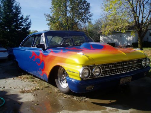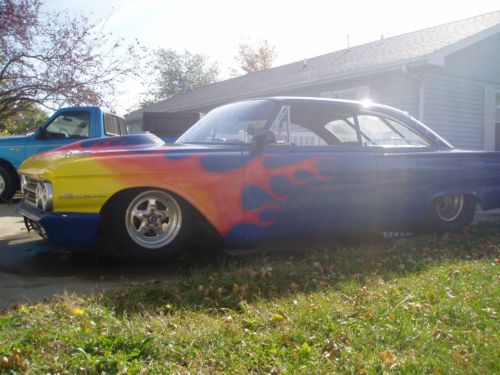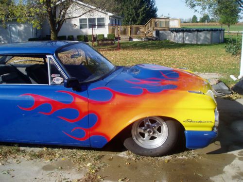 1961 ford starliner,all steel except hood and bumpers. 2x3 frame with complete 1 5/8 cage, pinto style front end, and 9 inch with 31 spline limited slip 3.90 disc brake rear. Ladder bar with coil over suspension. The drivetrain is 521 ford (385 series) , c6 transmission with gear venders overdrive. the motor has scat and eagle bottom end with probe pistons, the crank is cast and rods are h-beam. The cam is 650 both sides solid lifter with Harland rollers. Heads are tfs aluminum untouched except for valve springs to match cam. Offenhouser intake with 1050 dominator. The radiator was custom made aluminum with dual fans and shroud to live on street. Custom made flat dump headers for ground clearance since the car is so low. Three inch exhaust with walker 3 inch mufflers. Alum. 16 gallon with all braided hose and holley hp black pump. The convertor is 10 1/2 inch relatively tight for street. Two driveshafts one for no gearvendors od. This car is relatively old, about 15 years old, except motor and trans, which is about 5 years old and very little street miles since then. Never been on dragstrip or dyno , so hp is anyones guess, but does run good. payment upon pickup only
