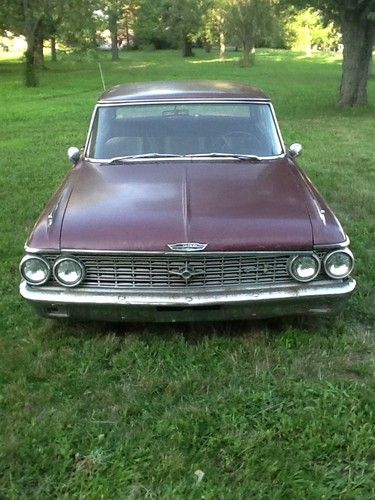 Up for auction a 1962 Ford Galaxie 500 with less than 102,000 actual miles. I purchased the car from a man who told me it was a garage find that he bought from an older woman. The car had belonged to her deceased husband. All original with the exception of a re-painting. Very solid car with very little rust and scrapes. These are shown in the pictures. I have owned this car for 13 years where it has sat in either my garage or barn. It has a 352 motor and a Cruiseomatic transmission, but is currently not running. The engine does turn over, but needs the gas tank cleaned and the brakes serviced to be drivable. It is not a show car, but is very restorable. It needs the interior redone including the headliner which is missing. The exterior needs some TLC and a quality paint job to restore it's true beauty. After I purchased the car in 2000, I put a whole new front end in including ball joints and idler arm. I believe my mechanic said it needed one more tie rod to be completed. I brought the car home with the intention of completing the restoration, but procrastinated and never finished the project. I am downsizing my home and possessions and no longer want to pursue completing this car. This vehicle is an amazing survivor and is fun to drive. Buyer will be responsible for transporting vehicle and the cost associated with the transport. I am setting a low reserve and have this car for sale locally and reserve the right to end this auction early. I use Paypal and prefer cash on pick up. Please, serious bidders only! Call me for any questions you may have about this vehicle. I prefer not to have text messages. Thanks for looking. Kerry 317.989.4434