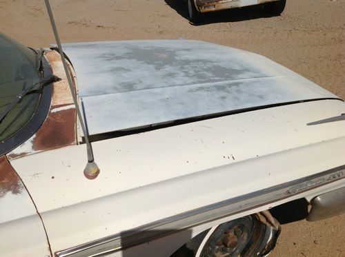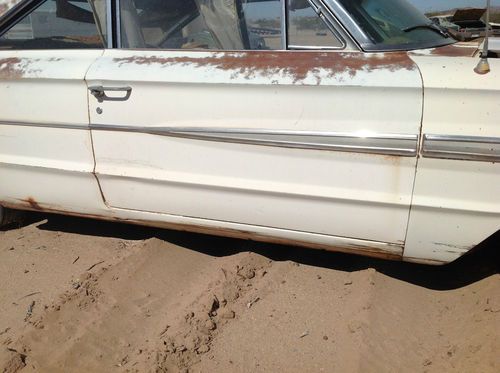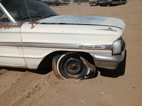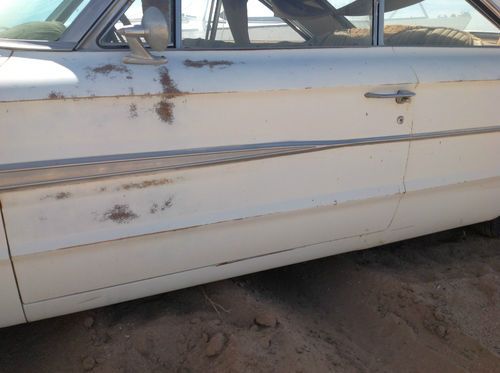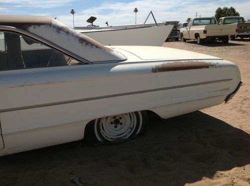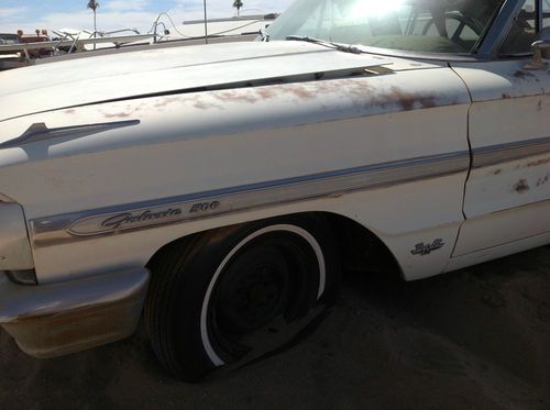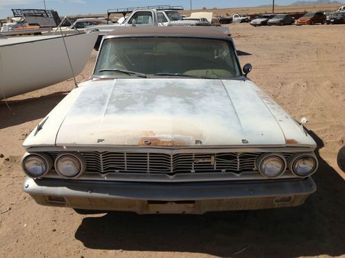 This is a 1964 Ford Galaxie 500 just rescued from the Arizona desert. It is a factory 390, 4 speed car. White car with white bench seat interior. It will have to be redone, due to the Arizona sun. Very nice straight body. Door tag decodes as 4 speed 3:50 posi car. You will look for a long time to find a better bodied car. Why start with a car that looks like it has been at the bottom of the ocean for 50 years? I will provide roller tires for the car. Car looks very solid underneath. Haven't taken the carpet out yet. Very complete car. If you have questions, please call 435-770-3337. Thanks