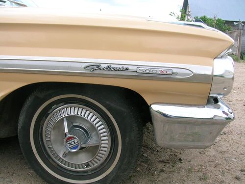 If you love factory stock cars, then this is the car for you. This 1964 Ford Galaxie XL 500 has 71,134 actual miles. The original owner purchased this car new in 1964 in Scottsbluff NE. We bought the car in 1997 and are the 2nd owners of the car. It has been kept in a garage since purchase. We drove it today when we took it out to take pictures. The interior seats are original, as is the carpet. It has factory installed air conditioning, and the original spare tire in the trunk. We purchased this car at an estate sale. The little old lady who bought this car new, drove it for years to go shopping. When she could no longer drive, she hired people to drive her to the store. We talked to the mechanic who serviced the car on a regular basis for her and he said it was a very good car. The car has a few dings that are shown in the pictures. The paint is original from the factory, I call the color a creamy yellow, my husband calls it tan, with a white roof. Factory color is Prairie Tan body with Wimbledon white roof. The car is as original, as the day it rolled out of the Ford Factory. This is a beautiful car in a very good condition as you can see by the pictures.