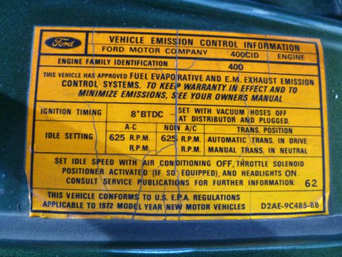 Engine: 400-2V M Trans: SelectShift 3 speed C-6 (code U) Ivy Bronze Metallic Green (4C) w/green vinyl top and green 500 cloth interior 3.89 rear gear ratio (code 2) approx miles: 81K OPTIONS & FEATURES Air Conditioning, AM radio, seatbelt warning, seatback locks, spare tire and jack, driver outside mirror, chrome lower trim, chrome body side moldings, full wheel covers, painted pin-stripes, power steering, power brakes, front disk & rear drum brakes, HISTORY: Vehicle was built in Ford's Chicago plant (code 41). Per the daughter of the original owner: Original owner bought vehicle from Elmhurst Ford (Elmhurst, IL.) as a vacation road trip car. He worked 3 blocks from home and walked to work. She recalled several vacations in the car and that her dad always took extra special care of the car and rarely drove it. Car very well taken care of from day one. He passed and the title was transferred into his daughters name for resale from the estate. Vehicle was then sold to me with 72k miles on it in 2006. UPDATES AND REPAIRS: After going through the car it was very apparent that the vehicle had been stored in the gentleman's garage for several years. Since my intentions from go was to have my older parents drive the car for local car shows and antique car tours, I went over the entire car and made sure that all options on the car worked. I then also replaced; tires, brake pads & shoes, wheel cylinders, master cylinder, and machined rotors and drums. Replaced few upper end gaskets, 160 degree thermostat, tune-up, pcv, air cleaner element, drive belts, flushed fluids, and installed Petronix ignition. Set base timing at 8 degrees and rebuilt the carburetor with one step up on the jet. Recharged the A/C with R-12. MY OWNERSHIP: Car has been basically trouble free for the 8 years I have owned it. Stored during the winter months, under a cover, in a heated warehouse. Summer months car gets driven to cars shows, cruise nights, and car club driving tours, otherwise parked indoors. It is now time to charge the A/C again. I have not been able to locate R-12 at this time. A/C will need to be charged and could be filled with R-134A, but in the spirit of keeping it original, I was holding out for R-12. Blower motor switch works on low and high only. I have not been able to find a replacement. Found a 1973 but it is not the same switch. Car could use a freshening again after the past 8 years of use. Meaning tune up and maybe a another carb rebuild. CONDITION: • Body and paint in very original great shape. One very minor ding up high on the quarter panel, but you will have to look very hard to find it. To skyline the sides of the vehicle it is very straight with very minor dings. Paint in great shape shines with no real blemishes to speak of. Painted stripe in great condition. Body does have some minor rust in the lower quarter panels by the wheel opening. Very minor and has not grown in size since I have owned the car. Car is very impressive, shows very well, and draws a crowd every time. • Interior in very nice condition; no rips, tears, or cracks. Carpet has minor wear on driver's side, but still in very nice condition. Doors cards are trouble free, seats, package tray, dash, cluster, etc. Smells like 1972. Interior shows very well. • Vinyl top in very nice condition; no rips, tears, or cracks. All corners very tight no lifting, no discoloration apparent. • Trim very presentable and in nice condition. Most trim is way above average. Bumper has small ding and a few on the stainless trim. Black outs on grille still black. All trim shows very well. • Trunk in very nice condition with factory coating still in place. No dents or rust to speak of. Factory jack and spare tire in place. • Engine bay in original survivor condition. This area could use some attention. Very minor surface rust and fading from heat. All mechanicals work as they should. I have not made any attempt to repaint anything under the hood due to the class the car enters at car shows. • Undercarriage does have some rust. Floors, body, and chassis is very solid, but does have a coating of rust due to ownership and garage parked in the Midwest. No real major concerns, just cosmetic. Galaxie has won multiple trophies and plaques at point shows, judged shows, as well as peoples' choice. Placing from first to third in 70's original closed. AACA concourse and survivor classes. Car has taken a trophy at every show it has been to. Very clean and original; my favorite part of the car is the paint inspection sticker from the factory is still on the cowl. Vehicle location: DOWNERS GROVE, IL. 60515 I have over 100 photos on file at http://www.fquick.com/garages/Ford/Ford/1972/6001 PAYMENT: $200.00 deposit via PayPal within 24 hours of auction end. Payment of balance in full is required in cash in person. Please contact me to set up a time frame. SHIPPING: I will not ship this item. If you wish to ship it will be the sole responsibility of the buyer. On Aug-22-14 at 14:45:23 PDT, seller added the following information: COPY AND PASTE THE LINK ABOVE TO GET TO ALMOST 200 ADDITIONAL PHOTOS - THANX On Aug-22-14 at 14:50:05 PDT, seller added the following information: Vehicle is *** ORIGINAL SURVIVOR *** |