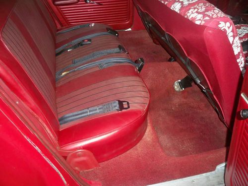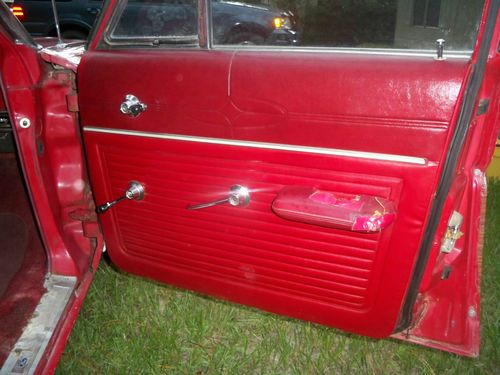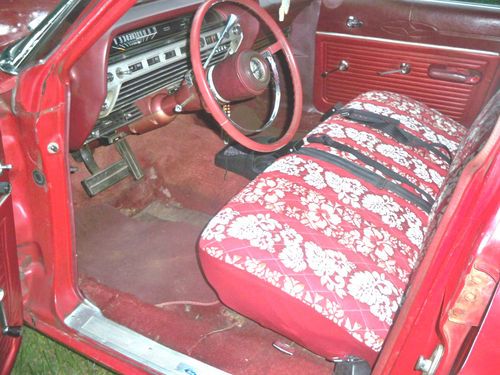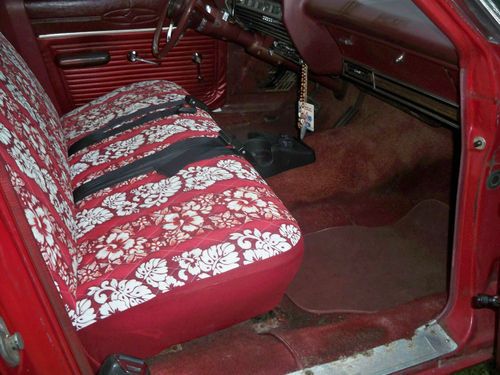 This car has the ever faithful Challenger 289. This one is equipped with a 2 barrel carb for good gas mileage and BBK shorty headers with true dual exhaust, Thrush mufflers, and chrome tips for the get up and go. It sounds like a chorus of angels singing an old Metallica song. You should see the looks on peoples faces when I pass them in the fast lane on the interstate. This is a well maintained DAILY driven hot rod. You can literally purchase this car and drive it back and forth to work everyday, immediately after you get it. Some listings say "drive anywhere" this car is driven everywhere! Though it has been in some shows (and won awards) this is not a show car. You may call it a rat rod or street rod. It's just plain bad. It has some small dings and patina paint, about 4 colors of red, and the chrome is good but not perfect. The white on the roof is kinda thin in spots. This car makes no apologies. The surf and skate stickers, and the board on top, really draw a crowd.