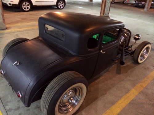 The body has been professionally chopped and channeled onto the frame with a custom firewall, trans tunnel and floor The frame is custom and is fully boxed and has been Zzed in the Rear with a beautiful glossy finish The motor is a 392 Oldsmobile with the matching Hydramatic transmission (reverse is all the way at the end) Offenhauser Intake Manifold w/ a Progressive Tri-Power Setup (center carb at idle and other 2 open at about half throttle) Custom Headers with Baffles (you can have a conversation at idle inside the car, but when you stomp on it everybody knows you're there!) 10 Bolt Rear with highway gears and Coil Cprings Disc Brakes on the Front (stops on a dime) Aluminum Radiator w/ Electric Fan Front window folds out like it is meant to Fuel Cell in the trunk w/ electric fuel pump Chrome Pulleys Reverse Lip Chrome Wheels with Baby Moons and Bullets Wide White Wall Tires all around (wider in rear) Front Grill, Firewall, and Frame are gloss black - the body is painted satin black Chrome Front Shocks Chrome Steering Arms The list goes on and on.......