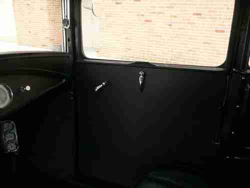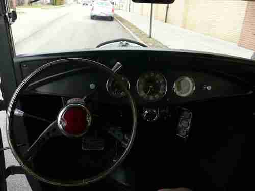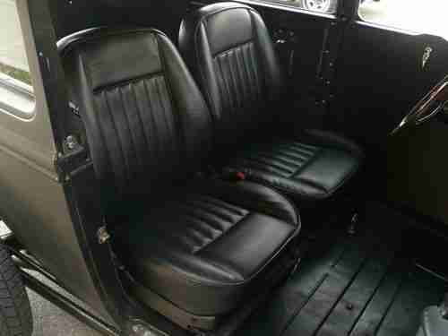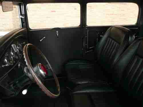 The sedan has new fully adjustable and reclining front seats with new black vinyl upholstery, the wood was replaced in this car before installing new ABS interior, when the new top was put on the the wood and chicken wire was also replaced, factory style gauges but I dont know what from? Under the dash gauges are modern style, steering colum is old school kool, steering wheel is home made complete with tail light horn button.