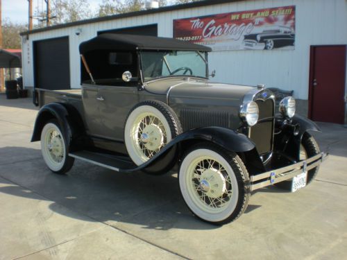 ~The Garage Is Proud To Offer~ 1930 Ford Model A Roadster Pick Up Brookville Extended Cab Body --RARE-- --RARE- --RARE-- The Buy It Now Price includes enclosed Shipping to your location in the US* This 1930 Ford Model A open cab pick up has received a comprehensive, no expense spared restoration top to bottom to show quality condition. Finished in Chicle Drab Body Color with Black Fenders, The body is a Brookville Extened body which makes it very nice for bigger people to fit into the truck. The original body is very very tight to get into which most people do not realize. This also has the adjustable seat which gives plenty of leg room. New Le Baron-Bonney folding top, seats and interior. It sports the louvered hood. It has the fun Sparton "OOGAH" horn, scripted Ford tailgate All running gear is original. The motor has been recently rebuilt. The Transmission is in great running shape the Clutch/Pressure Plate/Throw Out Bearing and U Joints are all new. New Cast Iron hubs, with new races and bearings. Many parts were powder coated for appearance and their anti-rust qualities. There were very few of these attractive, adaptable commercial vehicles that were built and their survival rate is extremely small, making this superbly restored and presented example particularly rare. This car is fun, nice and the perfect car for the quintessential collector. It truly is automotive art!!! *Shipping drop location may be limited. Shipping time is based on truck availability-dealer assumes no responsibility for unforeseen delays. Shipping is bonded and insured. Locations to deliver are metro cities though some areas may be excluded. Call for details. Buyer may pick up vehicle at showroom or make own arrangements for pickup. CALL FOR A SHIPPING QUOTE! ANYTIME! Other Features 4 Cylinder Motor (recently rebuilt) Manual 3 Speed Transmission on the Floor New Clutch/Pressure Plate/Throw Out Bearing All Original Running Gear New U Joint New Wiring New Amp Gauge and Switch New Water Temp Gauge New heavy Duty Radiator (For extra cooling capacity) Rebuilt Carburetor New Cast iron Hubs New Race and Hub Bearings New 12 Volt Alternator New Steering Wheel New Quartz headlights (12 Volt) New "Ford" scripted 3rd Brake Light All New Firestone Tires and Tubes New Cut Off Switch Rebuilt Speedometer New Modern Shock Absorbers New Belt and Hoses Thermostat Installed Rebuilt F100 Steering Box adapted for The A New battery and cables Running Boards Open Up Window Tailgate Chain Gate Protectors Gas tank has been cleaned and coated New Le Baron-Bonney folding top Wood top Brackets New Seats and Interior Mileage Exempt This car can be seen @ OUR SHOWROOM 15079 Ave 296, Visalia, CA 93292 Call Anytime!! (559) 733-2277 WE ARE NOW OFFERING CLASSIC CARAPPRAISALS/RESTORATION SERVICES IN THE ATLANTA AREA, EXPERIENCED CLASSIC CAR RESTORATION CONSULTATION, CLASSIC CAR PURCHASE ASSISTANCE, ESTATE PLANNING OF VEHICLES AND MUCH MORE. CONTACT US IF YOU HAVE ANY QUESTIONS. BID TO WIN!! CALL US NOW TO BUY IT NOW!! If you wait to end, it will not be yours! Make it yours today and call us to see how you can have it in your garage. MANY OF OUR VEHICLES SELL BEFORE THE AUCTION ENDS! CALL US NOW FOR DETAILS ON PUTTING THIS IN YOUR GARAGE TODAY!! 949-395-5681 CELL--Dee Coleman Email for more photos or call for any details at anytime. Thanks for looking. If you have a trade...please e-mail us complete photos....details and a phone number. We accept most anything in trade.