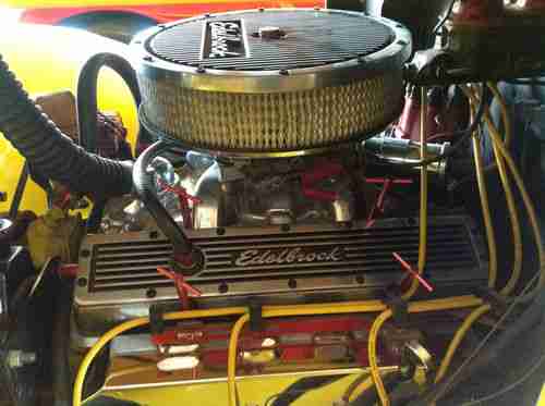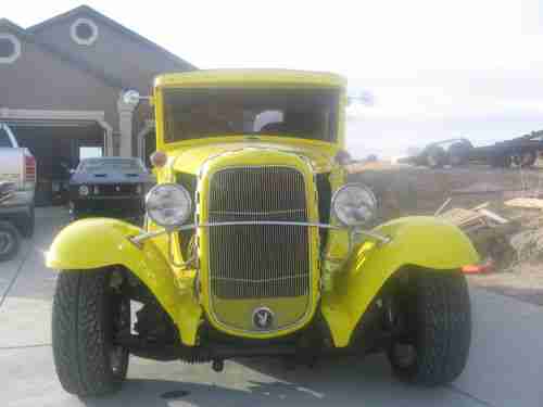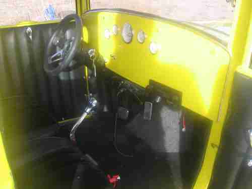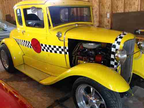 1931 Ford Coupe All Steel except fenders. No rust at all. Very solid car. Painted yellow with custom graphics on the doors that say Hollywood Taxi. Deck lid is also custom painted. 350 Chevy w/automatic transmission. Lots of Edelbrock engine parts, air cleaner, valve covers, aluminum manifold, etc. Runs great! Lots of chrome and red paint accents. New wheels and tires. Billet specialty wheels 17x10 on rear, 17x7 on front with Dunlop 255/60R17 on rear and Falken 215/50P17 on front. Custom red and chrome lug nuts. Mustang II suspension. We have the all steel full hood and most all of the receipts on fixing up the car.