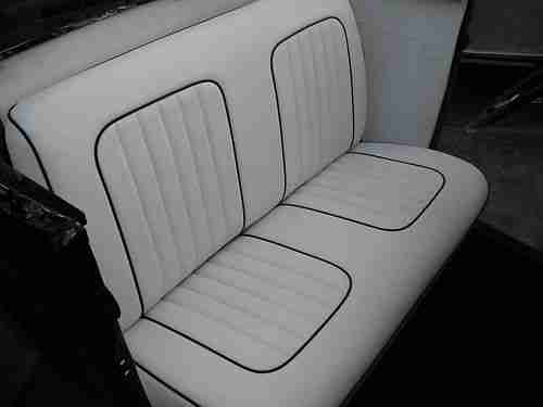 INTERIOR IS TRADITIONAL TUCK AND ROLL WHITE WITH BLACK PIPING. HAS HIGH LOOP BLACK CARPET WITH LEATHER DOOR STRAPS.