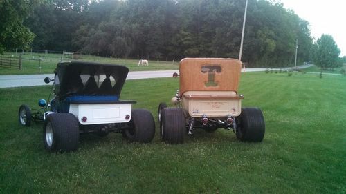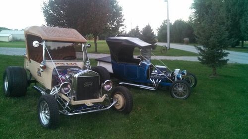 NEVER TITLED NO TITLE YOU ARE BIDDING ON ONLY THE BLUE ONE THE TAN ONE IS IN ANOTHER AUCTION 1923 t bucket rep. runs drives good has removable roof has centerline wheels on back 15x15 with mickey Thompson tires wire wheels on front has a 302 ford that is .30 over has new carb dist. water pump alt, starter and radiator has new master cly. wheel cly and lines BUT BRAKES NEED WORK thay stop but pedal is hard I MAY be interested in doing a trade call or text 765-490-0378