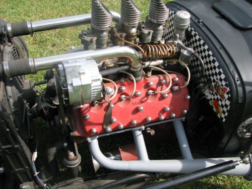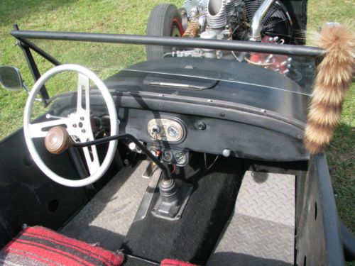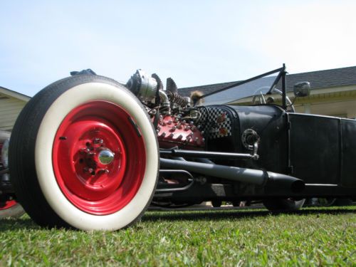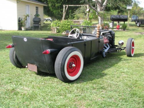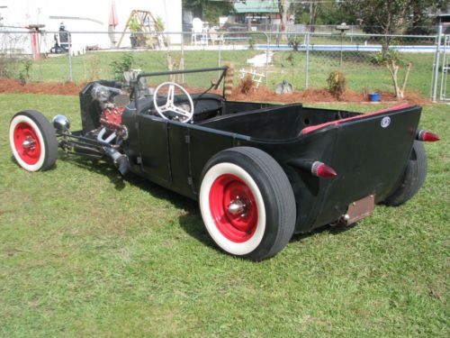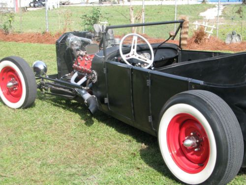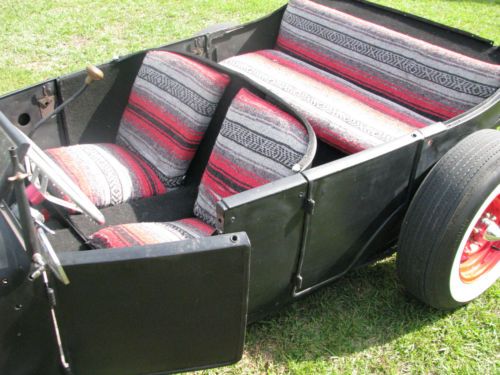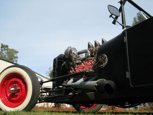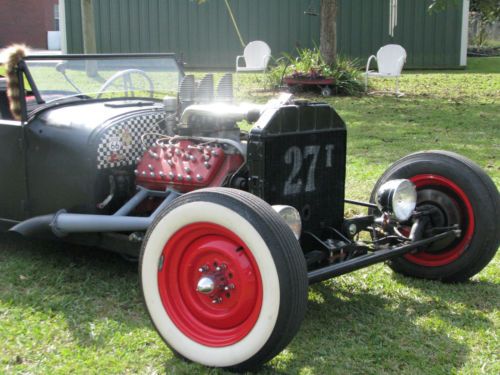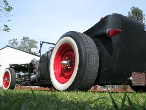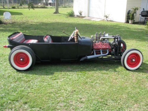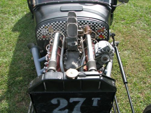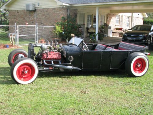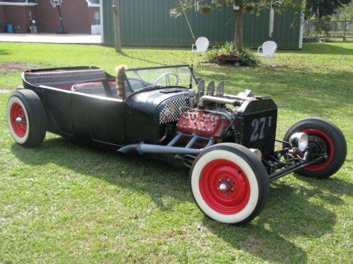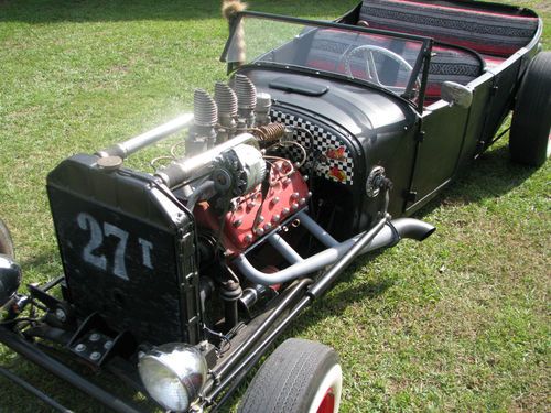 1927 Ford Model T Phaeton, Real Henry Ford Steel Phaeton, 4 Door Convertible. This car is a great car, true old school hot rod, drive any where, and enjoy. All original no rust body painted hot rod flat black, riding on a custom store bought chassis from Arkansas , nothing someone made in their garage, no worries. The chassis is all square tube, 4 link with coil overs on the rear, drop axle on the front with leafs and knee action shocks, the front suspension also has disk brakes. The car rides on smoothie wheels with white wall tires painted red. The fronts are skin and the backs are wider to give it that more aggressive look. The motor in the car is a early flathead ford 59 A-B, topped off with a 3x2 setup, with lake pipes and turn downs right beside the cowl. The motor is only running off the center carb right, I've found that their wasn't much of a differences running all three carbs, besides the fact that I get a little bit better mileage running off one carb, no real change in horsepower. The motor is backed by a C4 automatic transmission, and finished up at the rear with a late model Chevrolet rear end. The gas tank for the car is under the cowl, and you fill the tank with the air vent on the top of the cowl. The car uses the original shifter setup to give the car that old school look on the inside with the high handle and original knob, but is set up to work with the automatic, just straight forward and backward on the handle. The car actually has a smooth ride for itself, very smooth and hits the rode great. The car has a large radiator to accommodate the later model flathead motor, as well as a electric fan that pulls air, it comes on when the car is cranked and stays on the hole time the car is running. I've never had any issues out of the car over heating. The car has headlights as well as bright lights, the switch is on the floor just to the left of the brake pedal. The car also has caddy tail lights, that includes brake lights and turn signals. The interior of the car still retains two front seats and a rear seat and is capable of hauling 4 people. The steering wheel is removable, if someone needs to assist themselves in getting in the car or wanted to just keep people from thinking about stealing the car. The car has a full set of gauges, oil, volts, temp, and speedometer, which works and shows the actually miles on the car. The car has only 2,882 miles on the entire build. Pretty much a bran new car, that has been done a couple years but only been out for shows and cruse ins. The car is dirty in the pics, never really thought about cleaning the car because its a driver, one that gets enjoyed and all. Car will clean up better, specially the motor area, if someone wanted that cleaner hot rod look for car shows and all. I always thought that the little bit of dirty look gave the car a more rustic look. Like I said the car hits the road great, no issues, no problems, and everything on the car works perfect. The car is for sale locally and is subject to be taken off If sold. The car is sold as is with no warranty. A 25% deposit is due within 3 days of the auctions end and the balance within 7 more when the car is to be picked up or arrangements are made for the car to be shipped. If you have any questions about the car please fill free to ask and I will gladly answer them to the best of my ability. Thanks and God Bless, Kody 251-454-5455