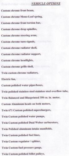 1925 custom dual engine model T. One of a kind custom everything. See photos for list of everything. Invested over $200,000.00 in this vehicle. Appraisal came in at $168,000.00 replacement parts only. No labor was included in the appraisal. Willing to sell for $120,000.00 or best offer. SERIOUS OFFERS ONLY !!!! Contact me at 949-337-8257 with any questions. ask for Jerry