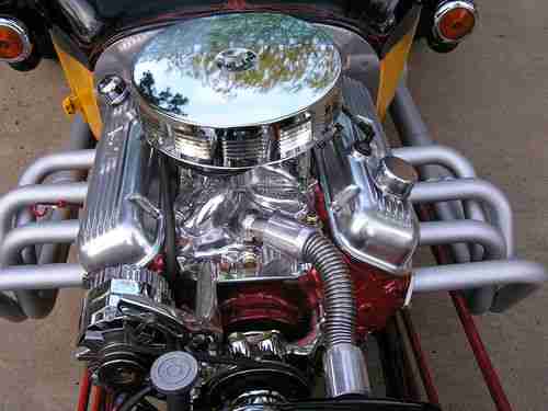 This is the classic ultimate barn find. A very well built '23 T Bucket from the early 70's judging by the build. Must have been a very high dollar car in it's day. I actually purchased it just for the engine that I am going to run "as is" in my old school gasser. It had a high performance early model 454 in it with real Chevrolet factory 1968 L-88 aluminum heads on it. It now has a very low mileage ( 17,000 miles ), great running, and freshly painted, but basically stock,1982 big block 454 Chevy in it. It is running a great shifting 400 Turbo and single track 12 bolt rear end. It is still faster than you want to go in a car this light. It still lifts the front left tire off of the ground when the pedal is hit hard, and absolutely fries the right rear tire. It has the old school Buick finned aluminum brake drums on all 4 corners. Stops great. Old style 4 link rear end suspension with coil springs and chrome shocks. Front suspension is old school also. Drives, stops, and steers great. The body must have been a high dollar one also. Very thick fiberglass with working passenger door. No stress cracks anywhere. The paint is in awesome shape too. It definitely withstood the test of time with very little, if any, wear and chips. The frame is even pin stripped underneath the body. The interior also must have been very expensive in it's day, but it is showing signs of wear and repair. All gauges work including the speedometer and odometer. I was told the 10,000 miles it shows is actual mileage. From the car's overall condition, I'd say it is accurate. Old school headlights. '32 Ford steel grille shell cut down to fit. Vintage windshield frame. The shifter is the only item that I think was updated until I switched engines around. The steering column could use one of those modern day braces, but it never had one before and lived thru it. The brake pedal could also use a return spring, but never had one of those either. Car runs very cool with an electric fan. The cloth top and frame is in very good shape, but it looks much cooler with the top removed. The tires are old bias ply wide white walls. Decent tread, but I would replace them before I took any long trips, because I have no idea how old they are. They are not all cracked up though.