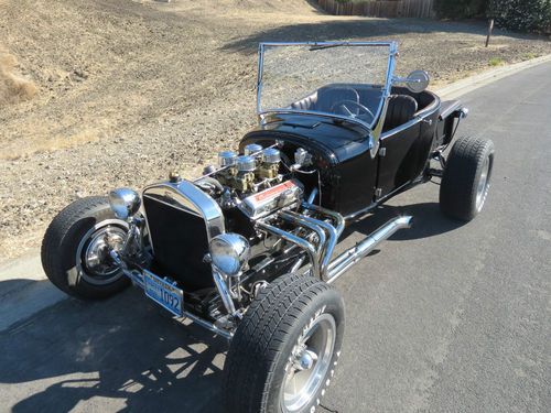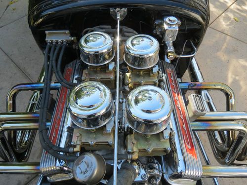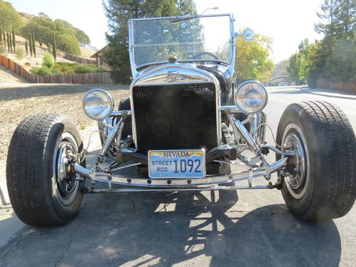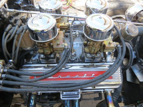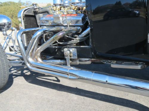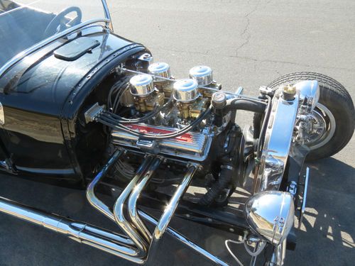 1927 Ford T-Bucket, all fiberglass, rebuilt 327 chevy motor, 4, 2 jet Rochester carbs, this car has a lot of chrome extras, seat belts installed. This is a car that was left in a huge estate we inherited, I have limited information on it. What I have learned and heard from close friends is the motor is a 327 and was recently rebuilt with a mild cam, I however have not checked the casting numbers to confirm the motor size. It was driven on occasion and was kept insured, registered, and garaged in a shop in the middle of Nevada from the day he purchased the car from the previous owner. We put in new accelerator pumps in all 4 carbs and changed out the gas, it fired right up. It runs and drives very nicely with plenty of power. There is never a shortage of looks and thumbs up driving this one. I am giving this information to the best of my knowledge, please feel free to ask any questions before bidding and I will do my best to answer them.